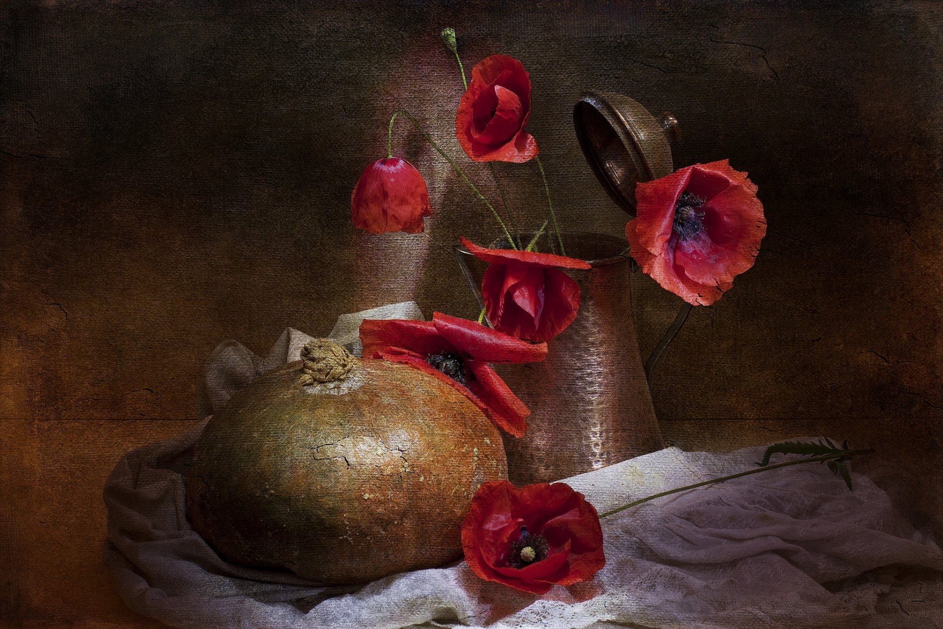 Vintage-style still life with jug, poppies and pumpkin