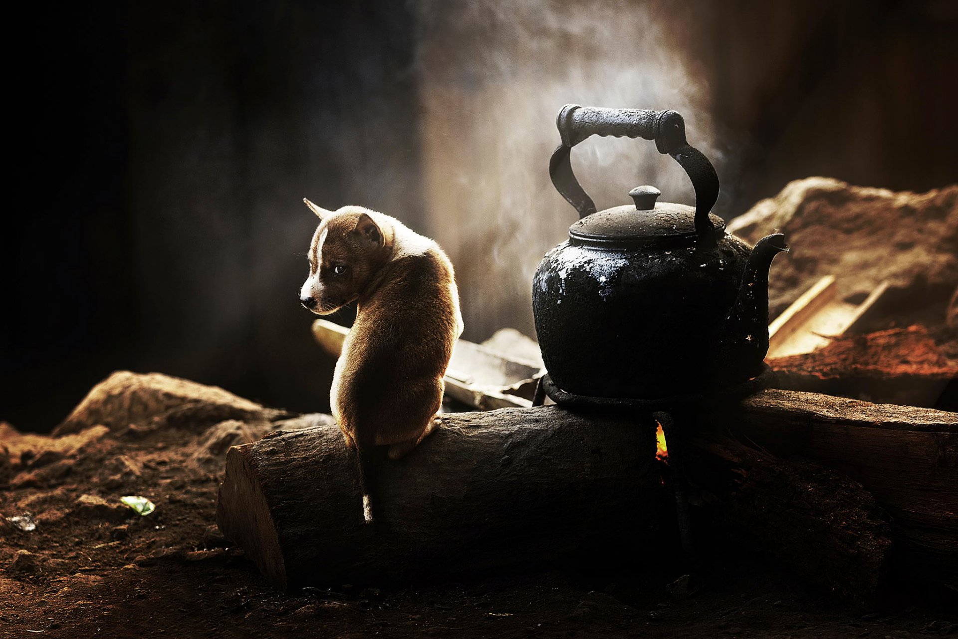 The puppy sits and guards the kettle