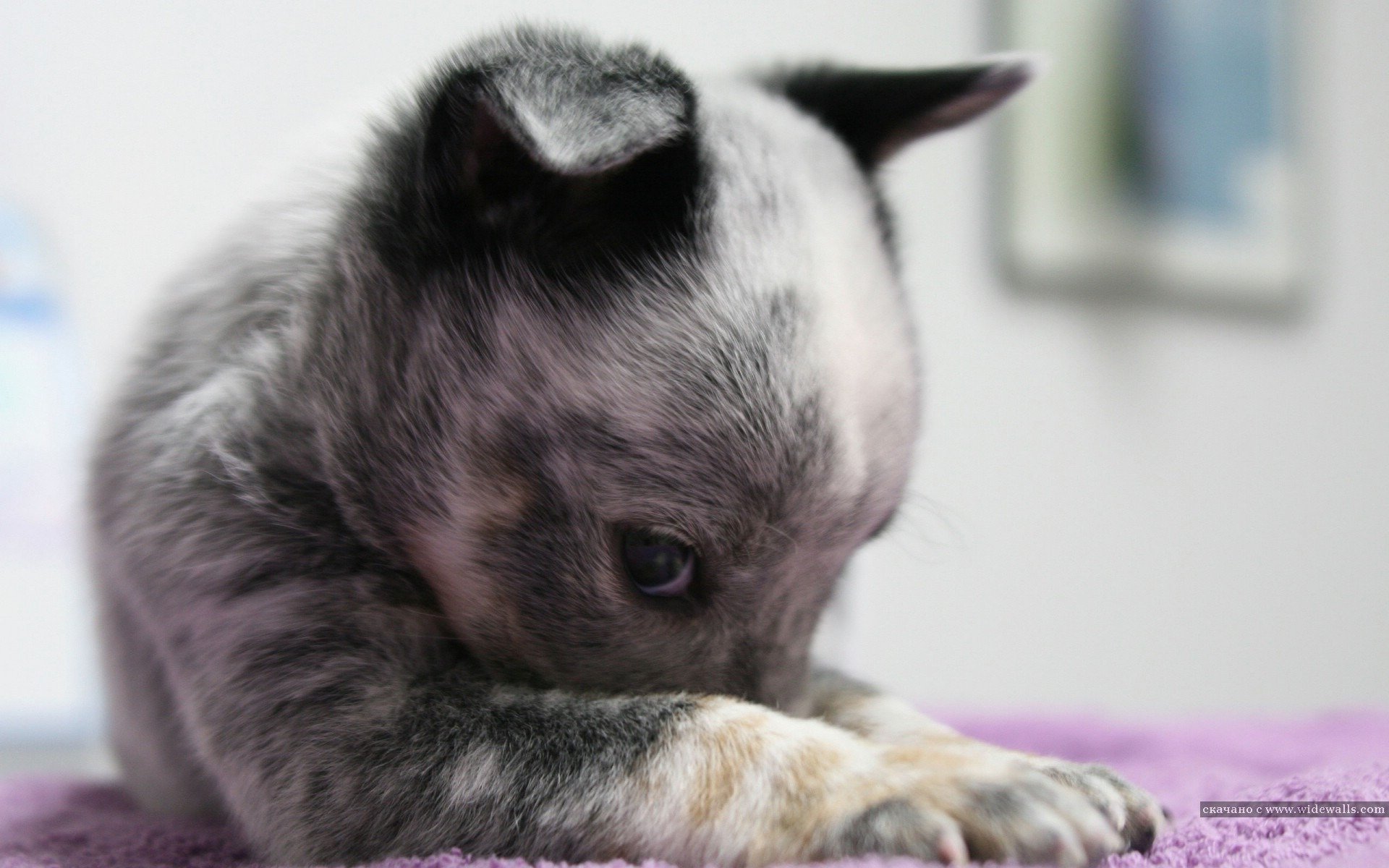 At home, a smoky puppy plays with a carpet