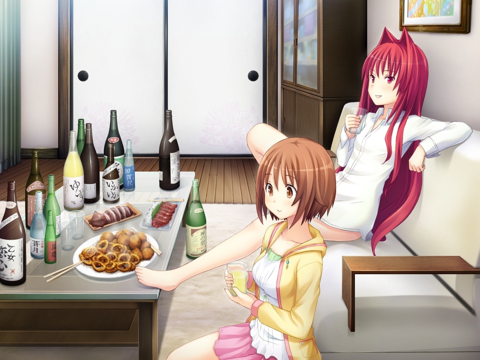 Image tags:red hair, short hair, brown eyes, red eyes, long hair, animal ears, food, brown hair
