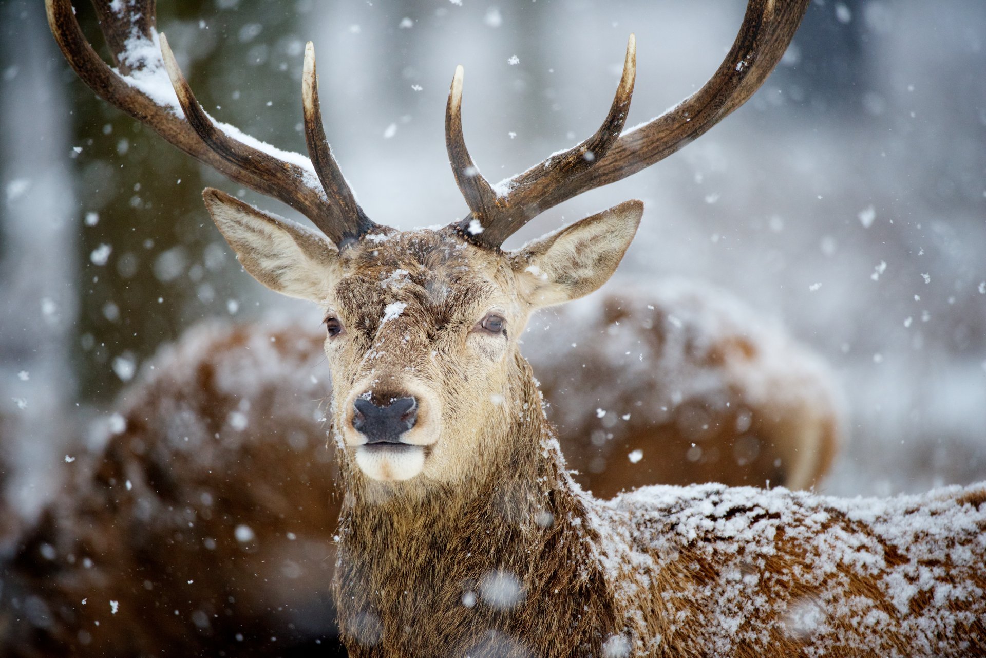 Deer with big horns on the background of falling snow