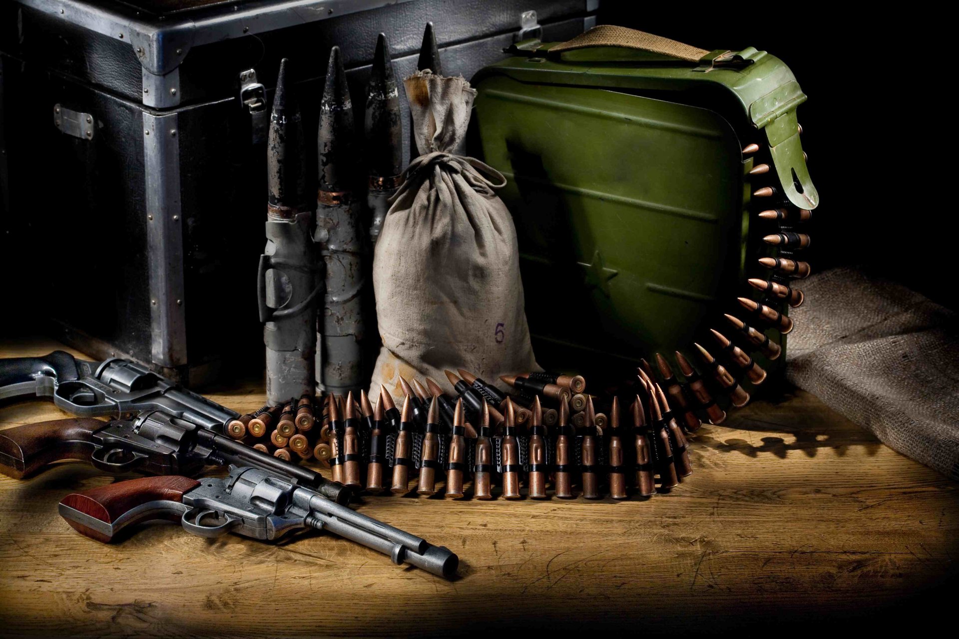Revolvers, pistols, cartridges and a bag are next to the chest