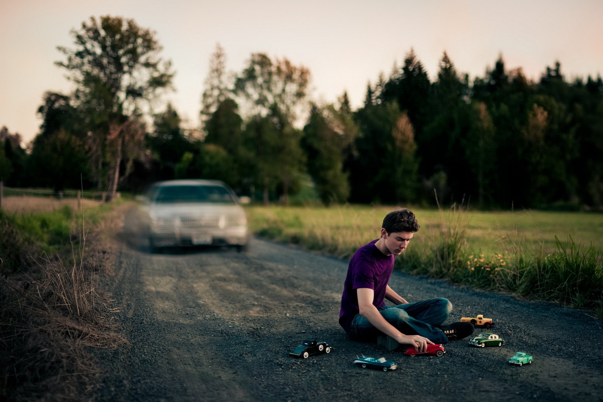 The guy is sitting on the road and playing with cars