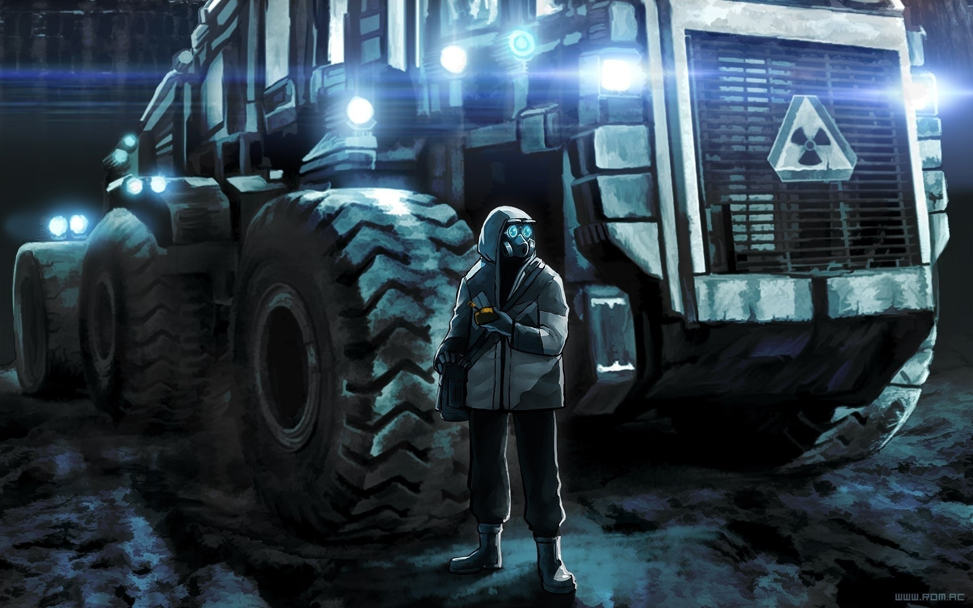 Apocalyptic comics. The hero in a respirator is standing by a big car