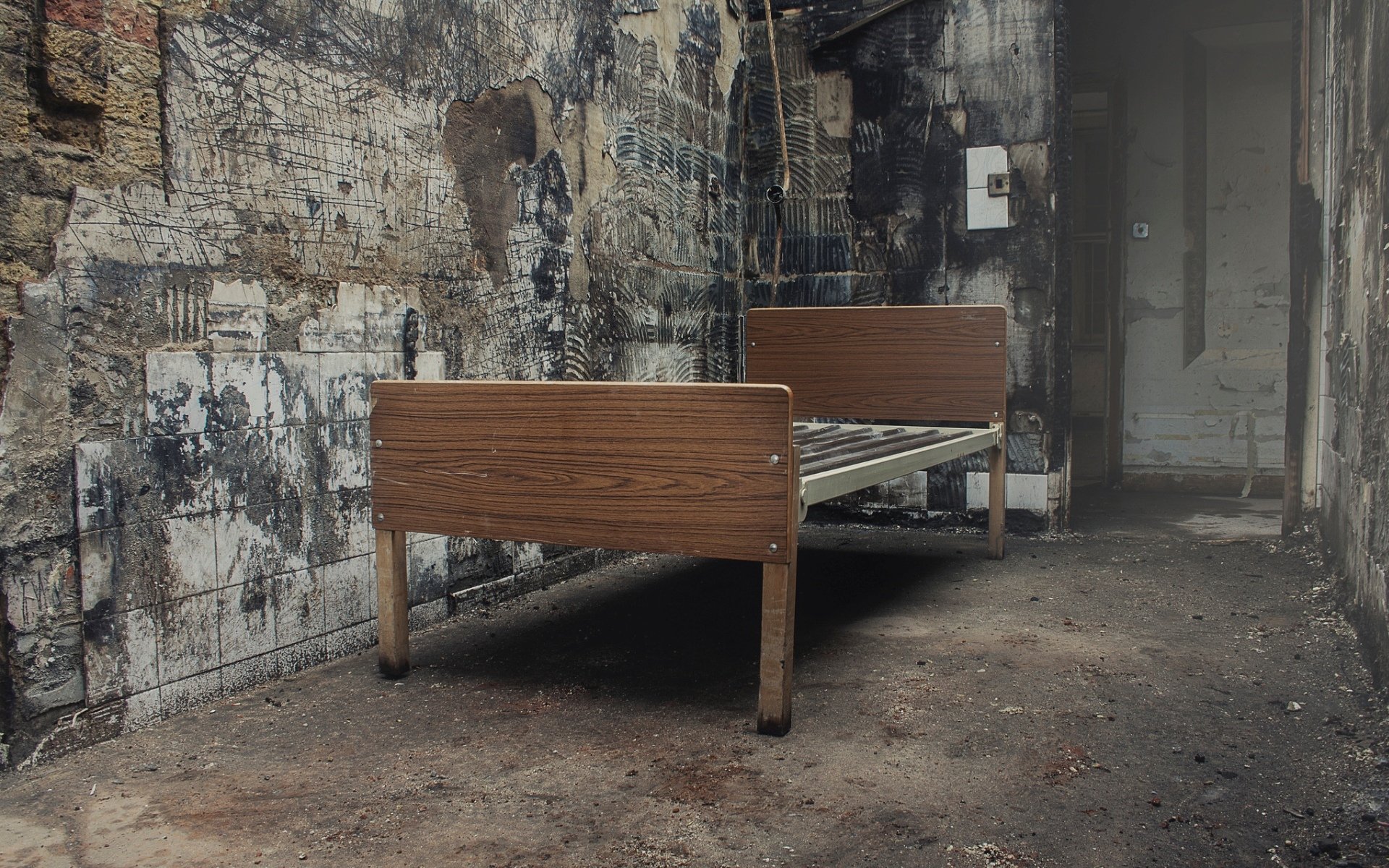 An abandoned room with a bed near the door