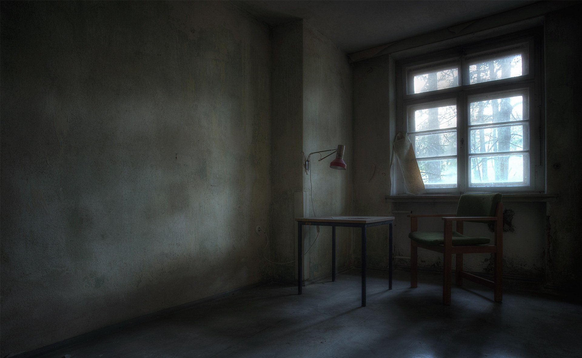 A room with bare walls and a table by the window