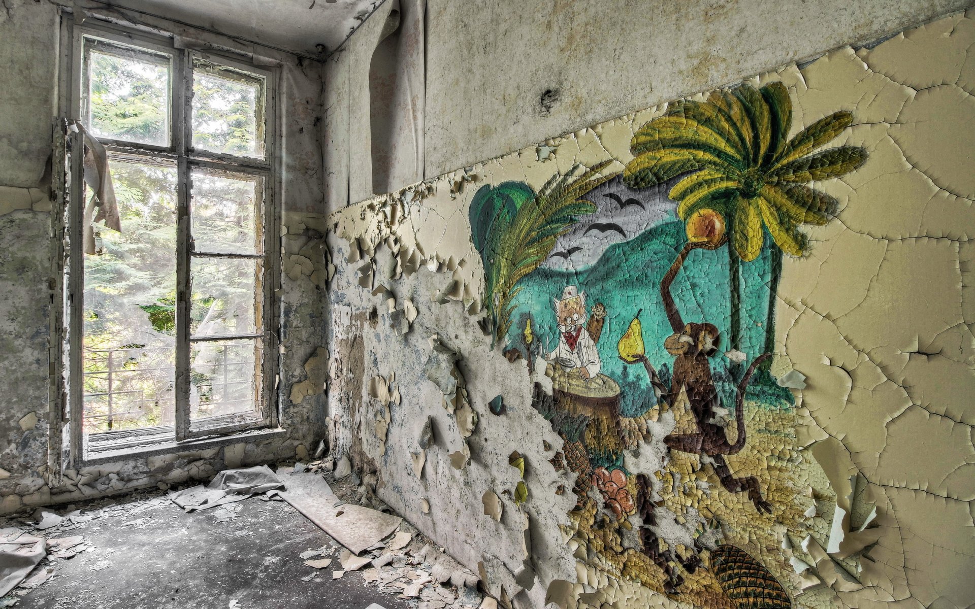 A ruined room with a window