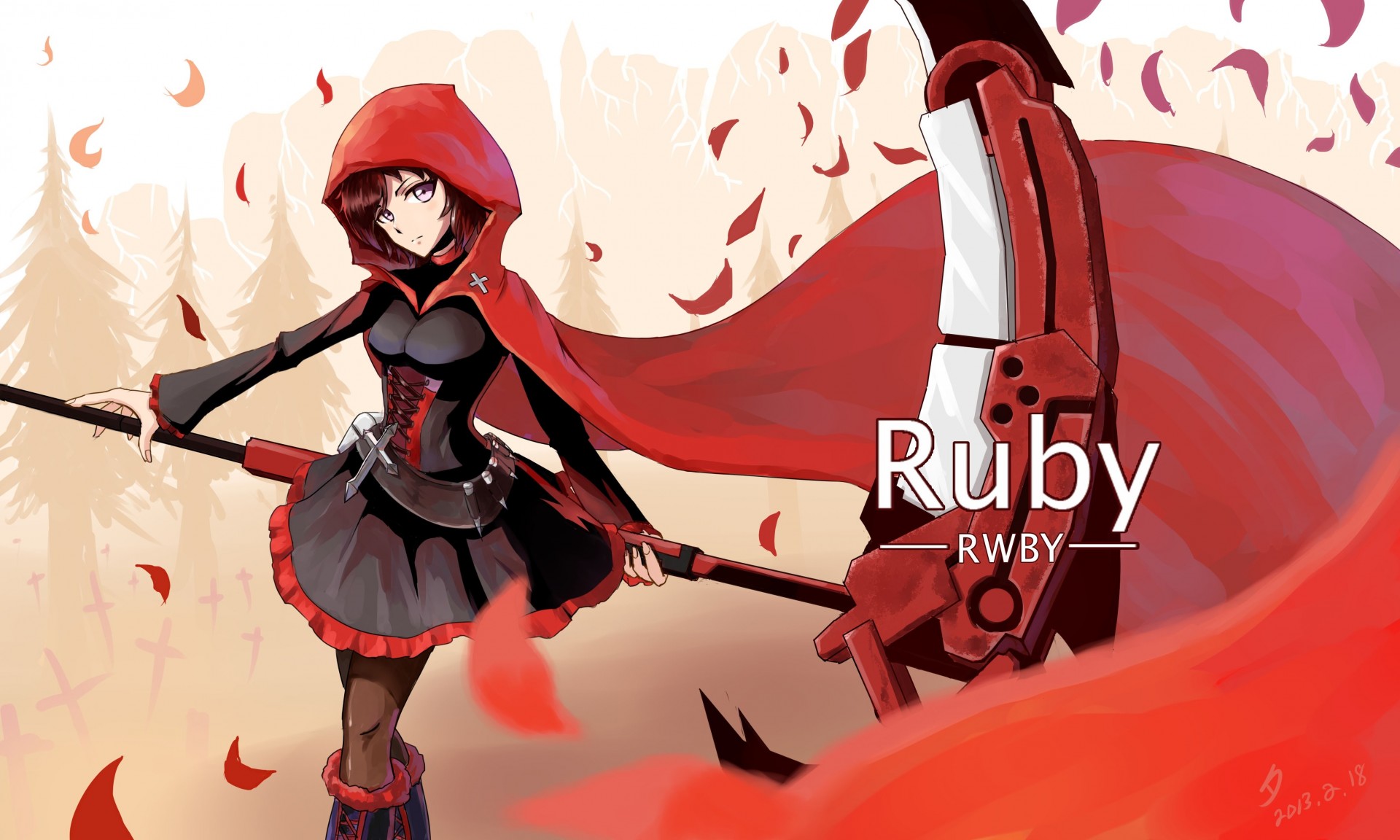 Image tags:ruby, boots, petals, skirt, red, corset, tights, spit, pink eyes, weapon, brown hair