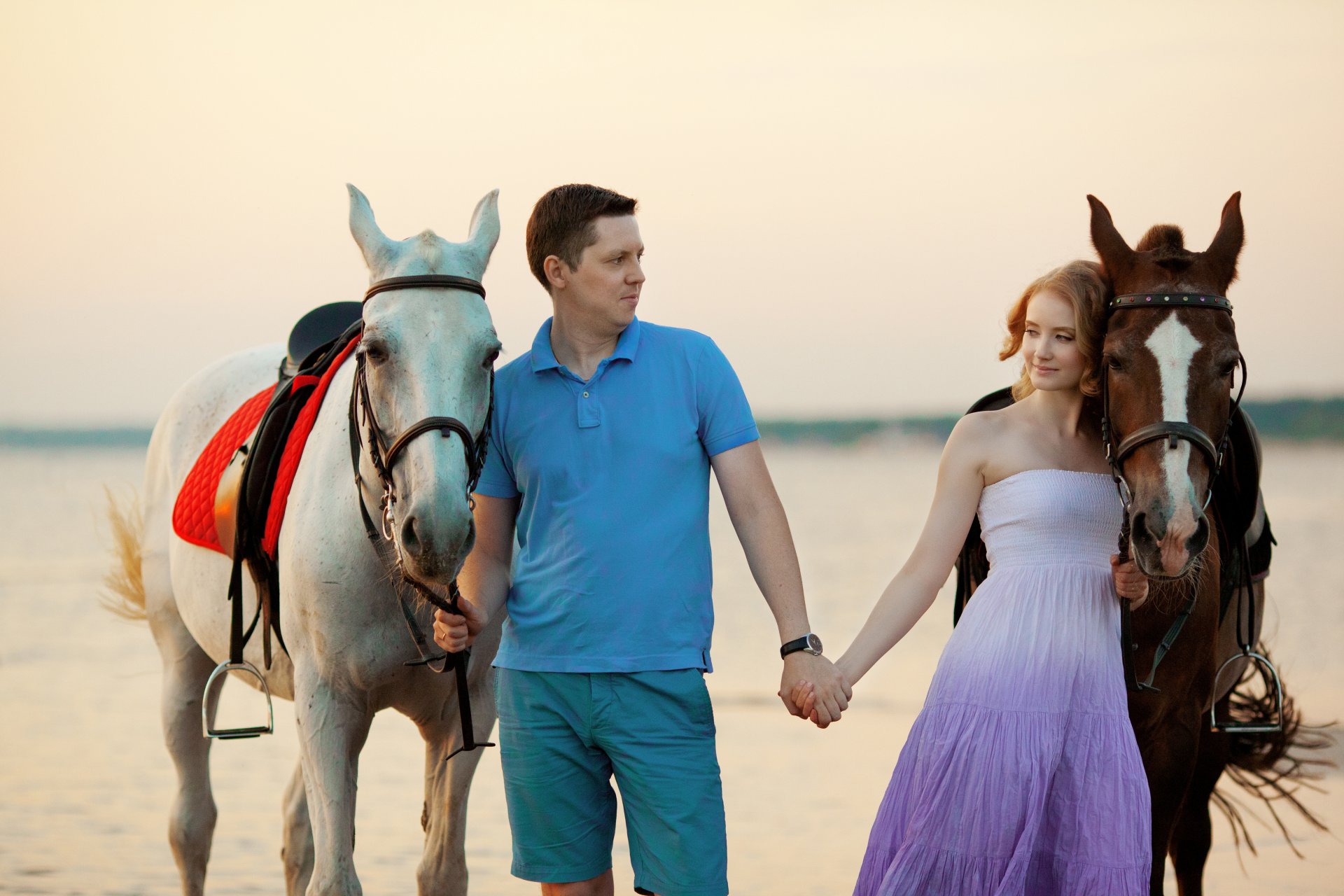 Guy, girl and horses at sea