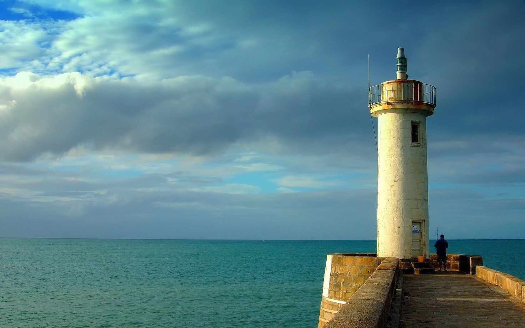 A lonely fisherman at the lighthouse on the sea