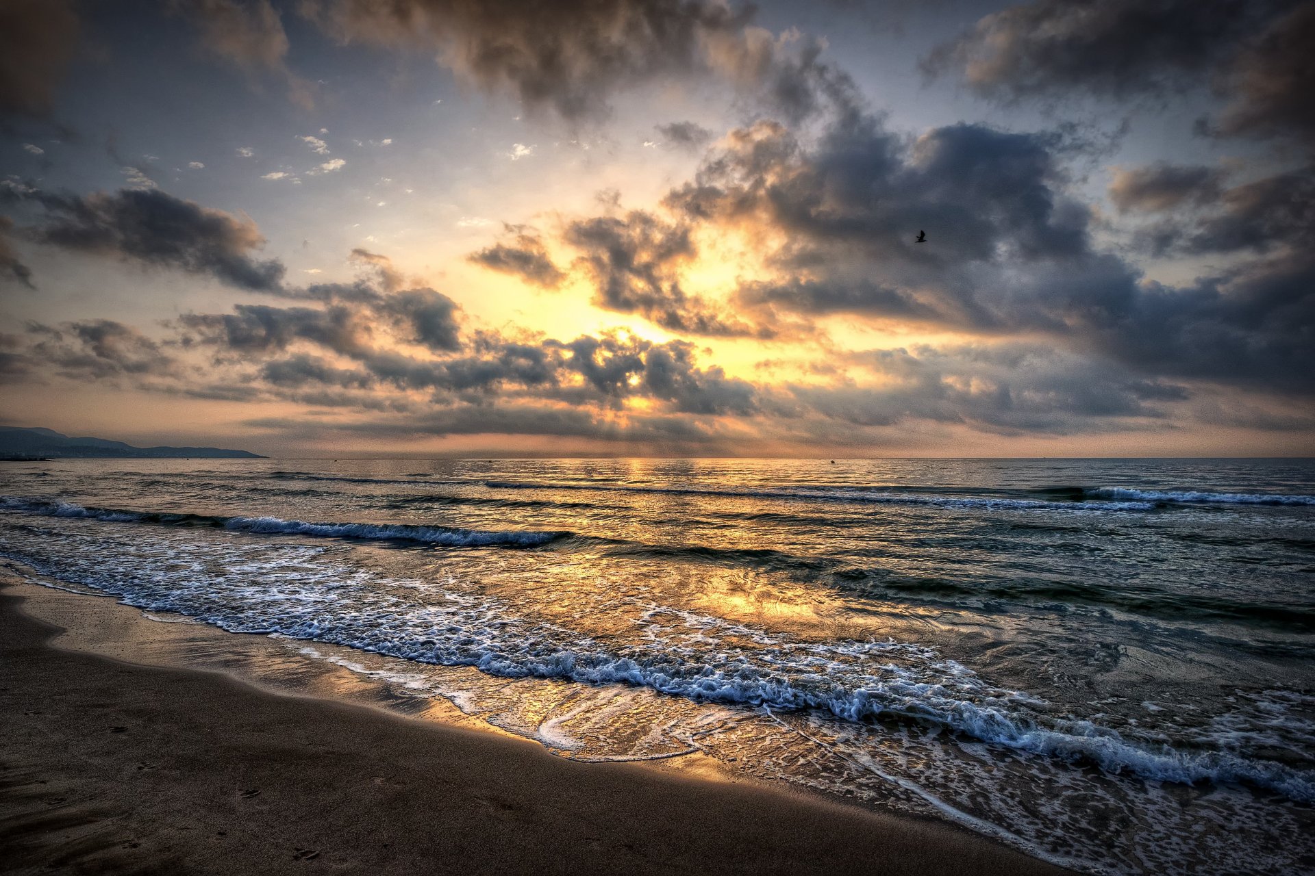 Sea with waves and sand during sunset