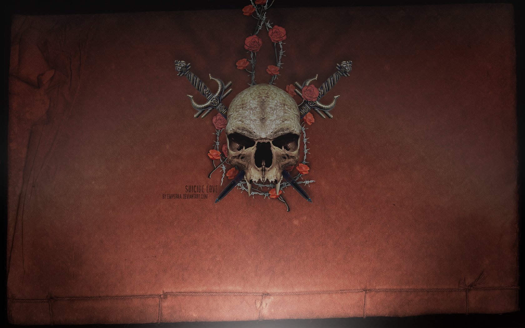 Skull with daggers and wire with roses