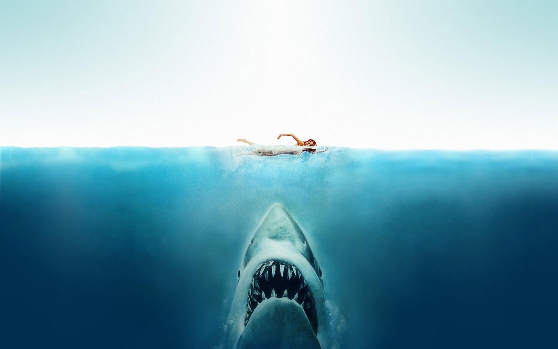 A girl swims over a shark in the blue sea