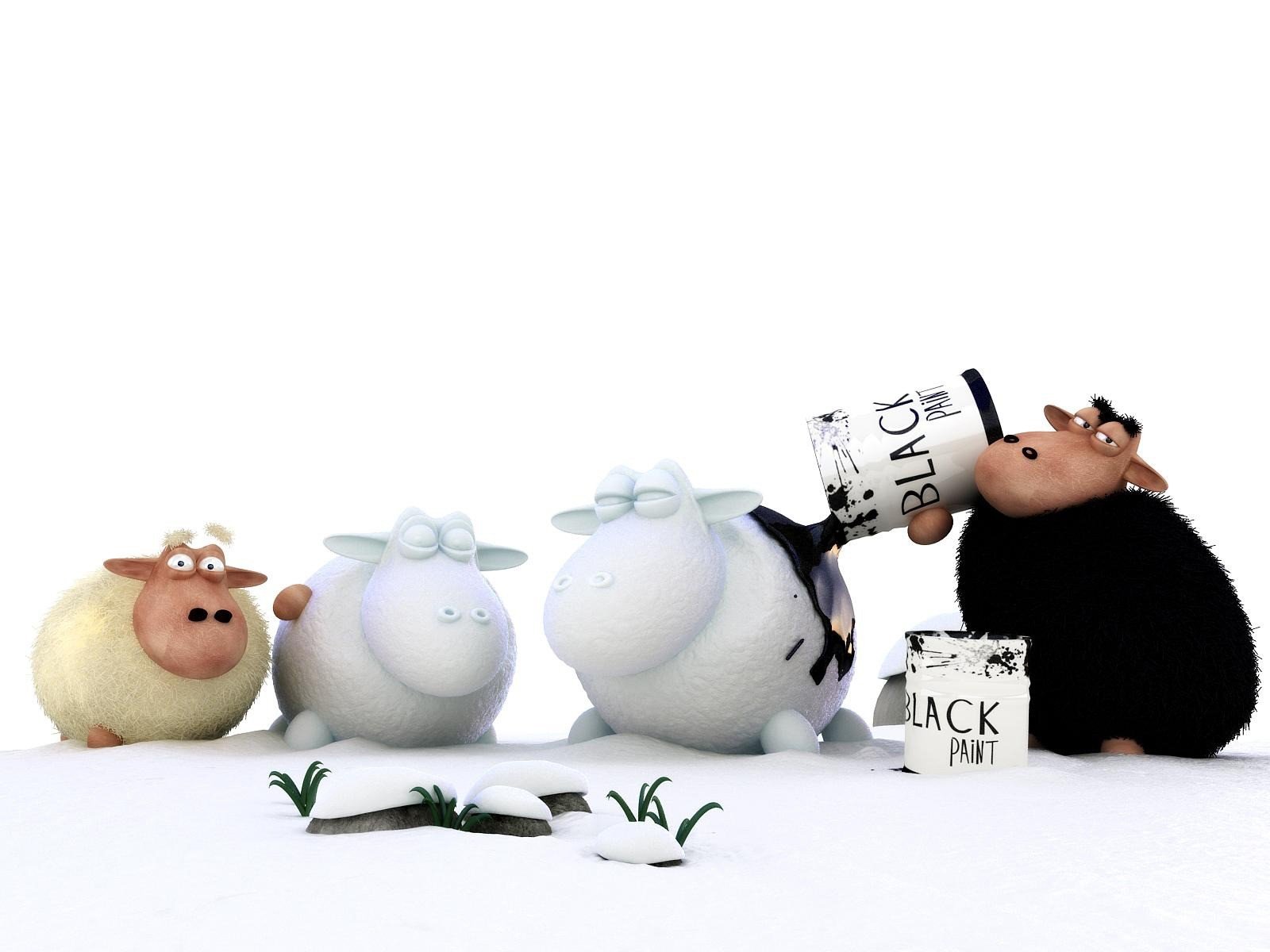 Black lamb paints white sheep in the snow