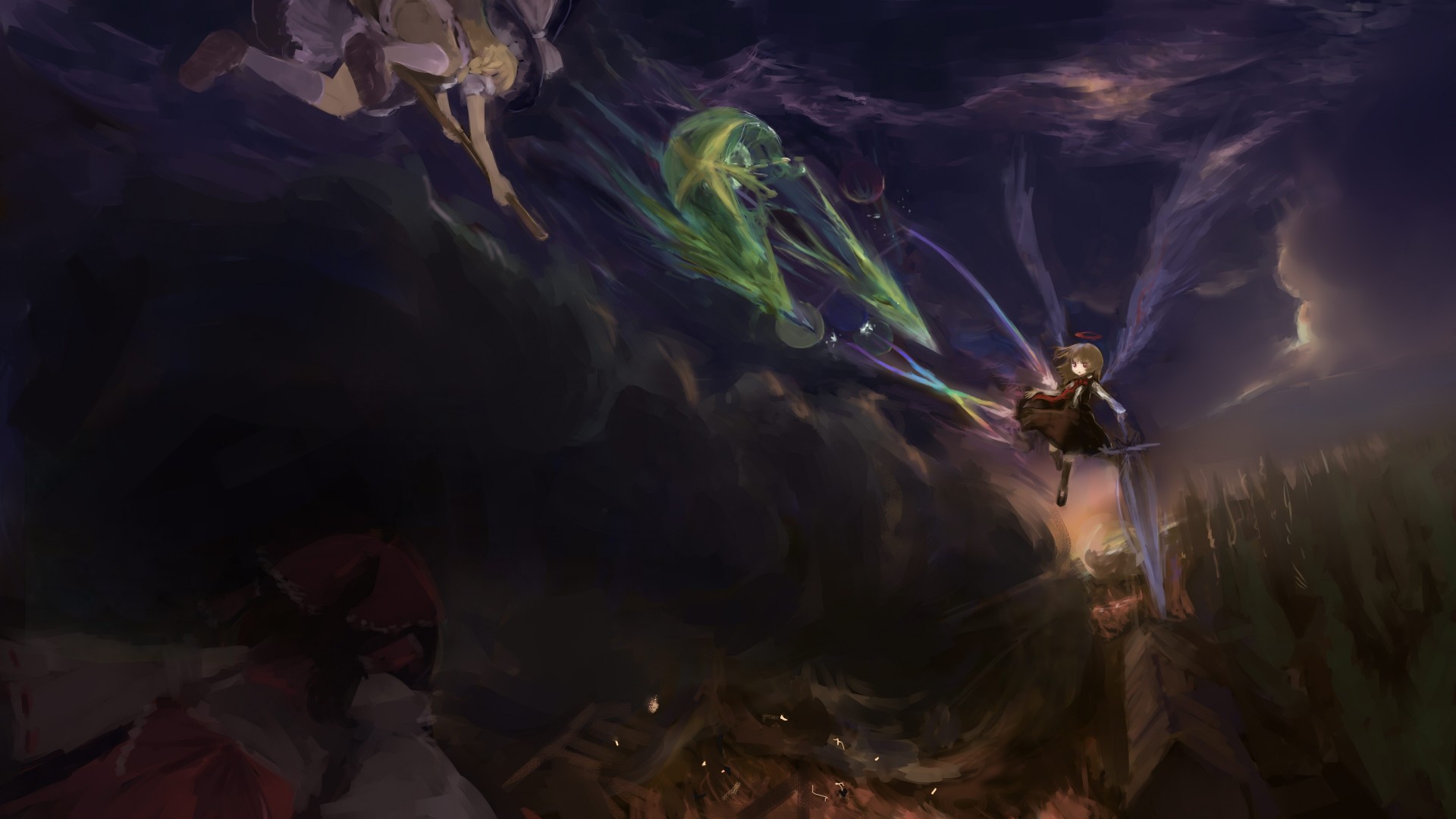 Image tags:short hair, witch, hat, red eyes, weapon, japanese clothes, halo, sword, 3girls, wings, brown hair