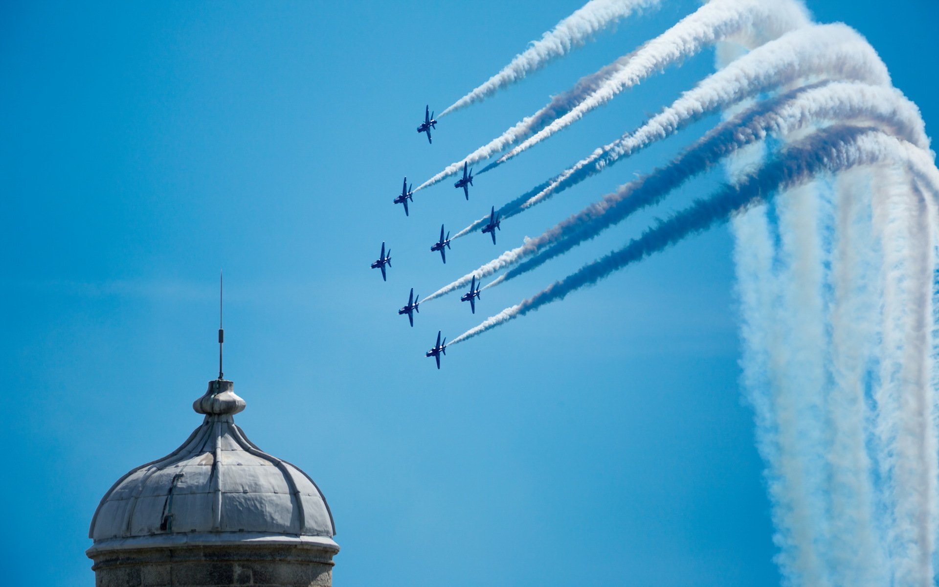 Show in the sky planes go in a wedge leaving streaks