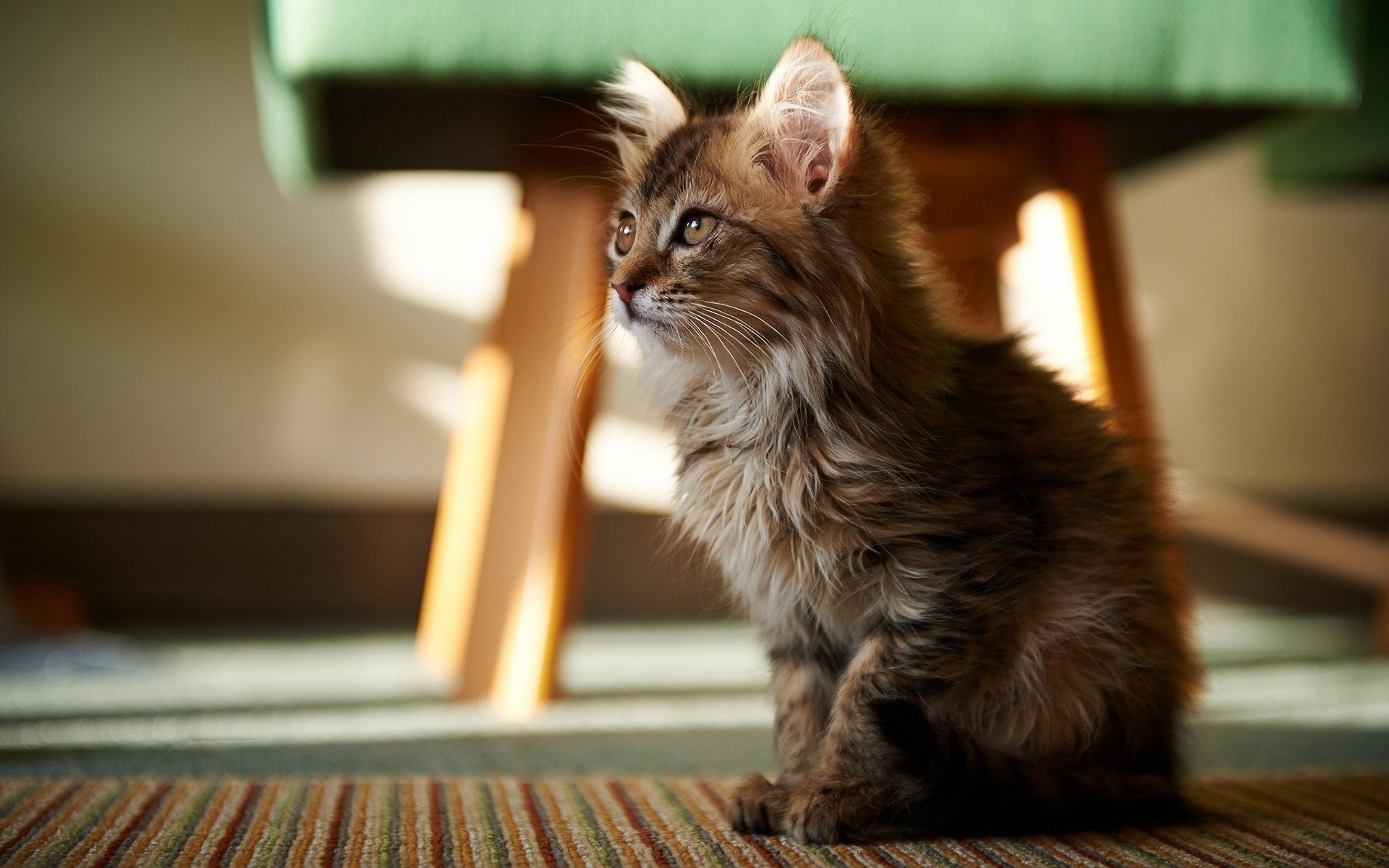 The kitten sits on the floor near the stool and looks into the distance