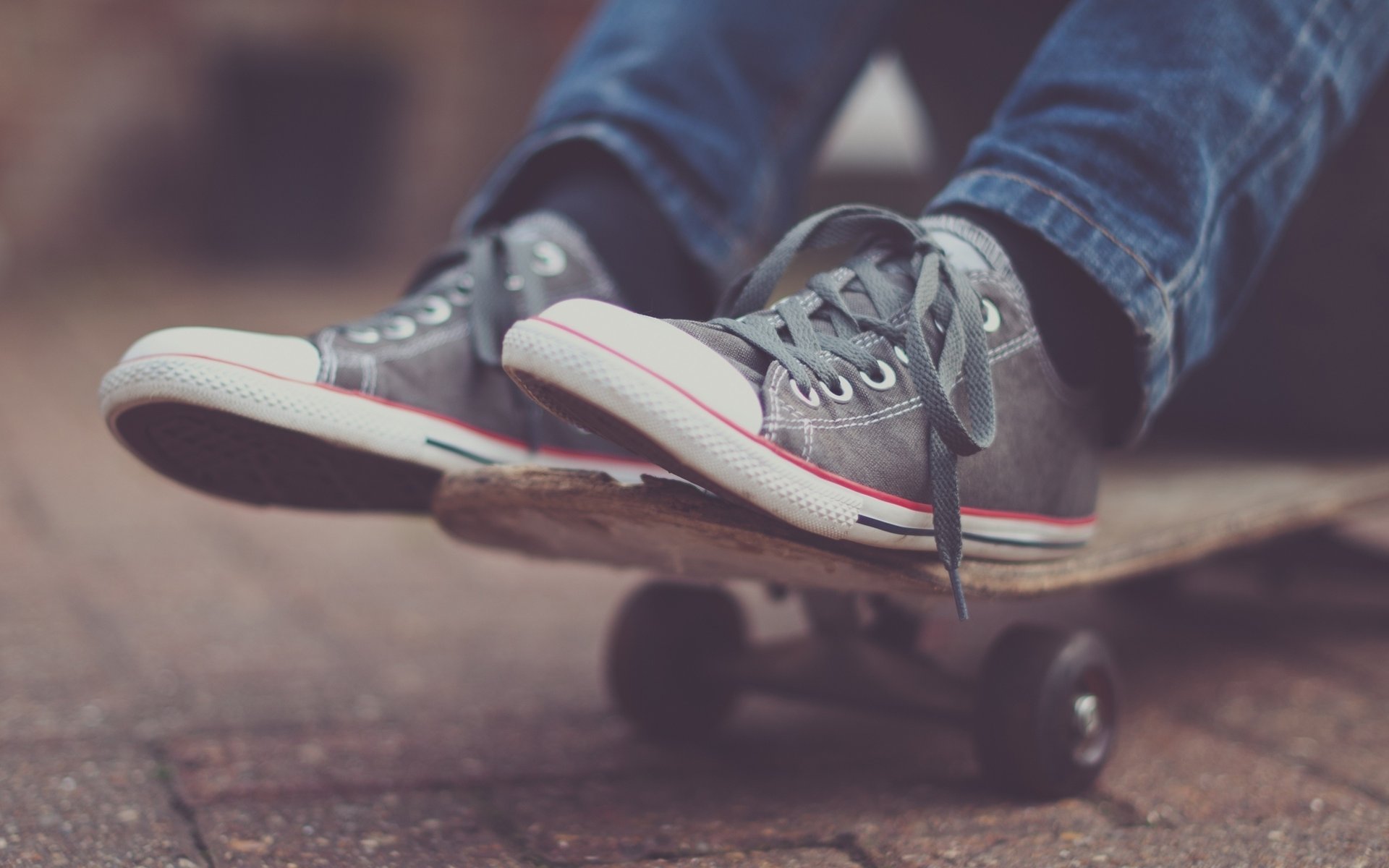 Skateboard on the asphalt, feet in sneakers