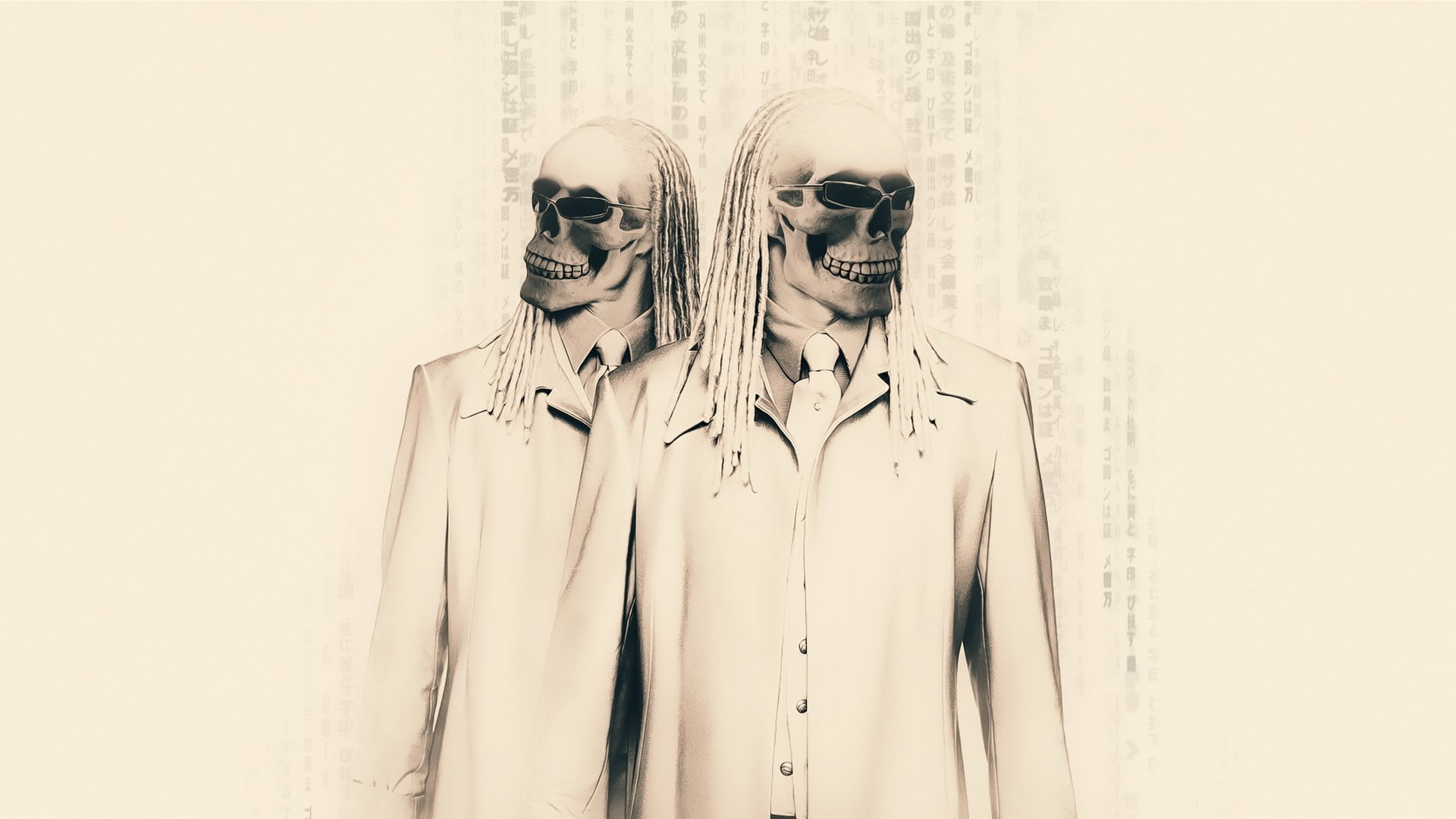 Skeletons in white suits with dreadlocks