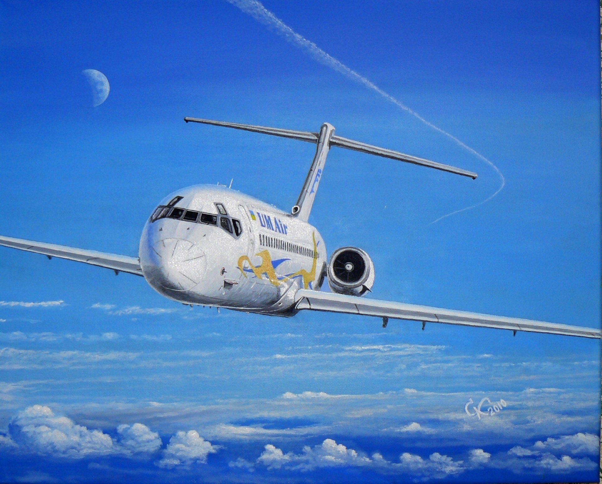 Oil painting by Sergey Konovalov airplane in the sky above the clouds