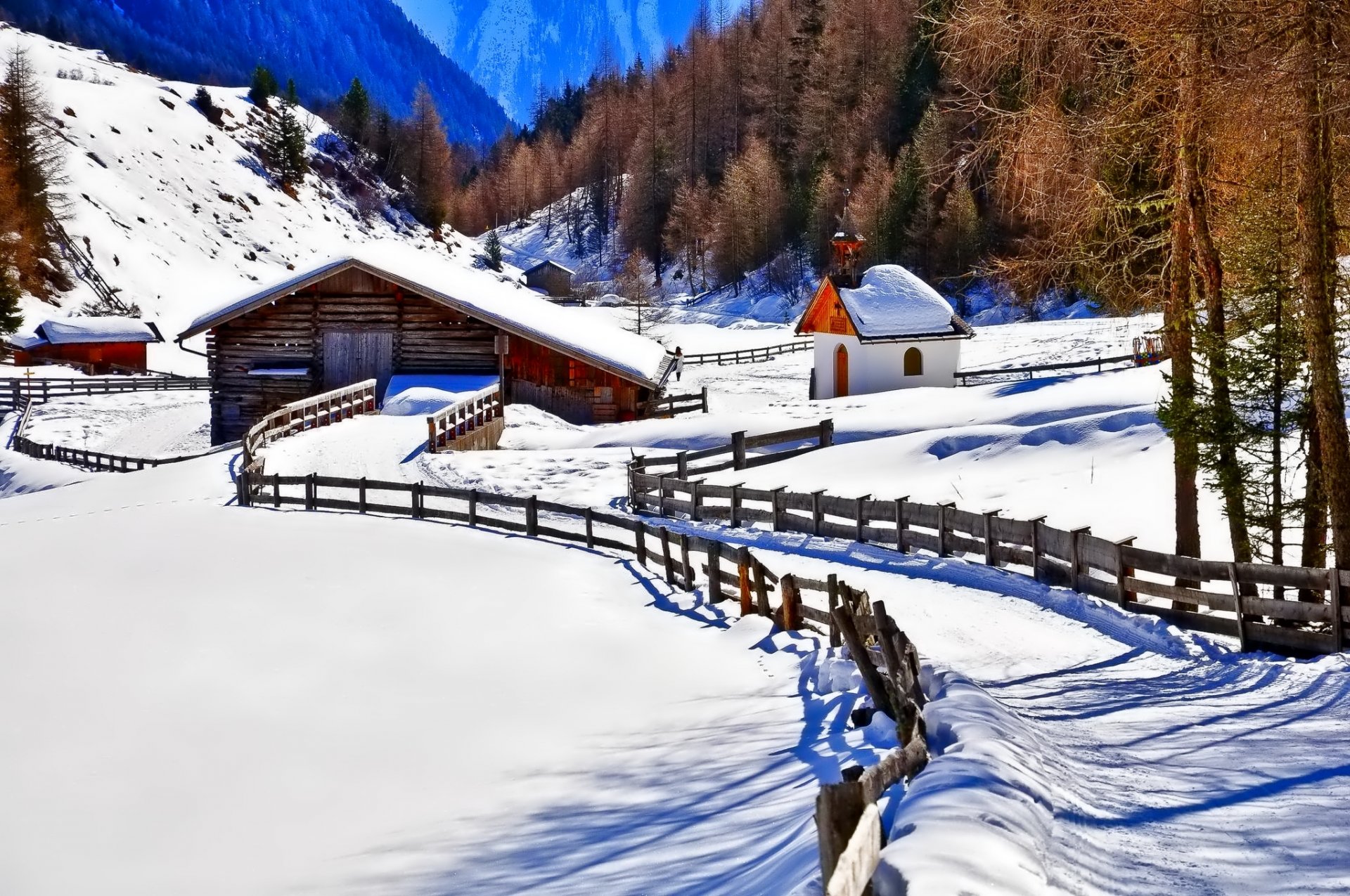 Winter mountains with forest, covered with snow. In the lowlands there are houses with a fenced road