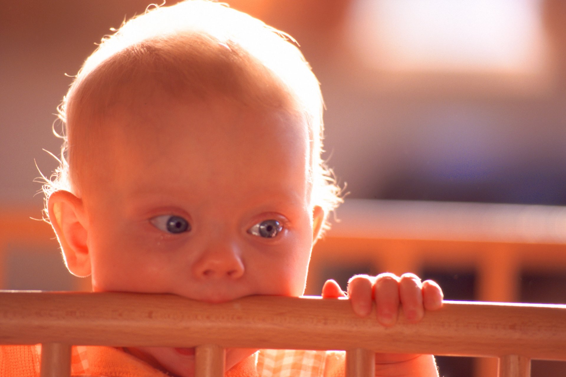 A little boy is sitting in a crib