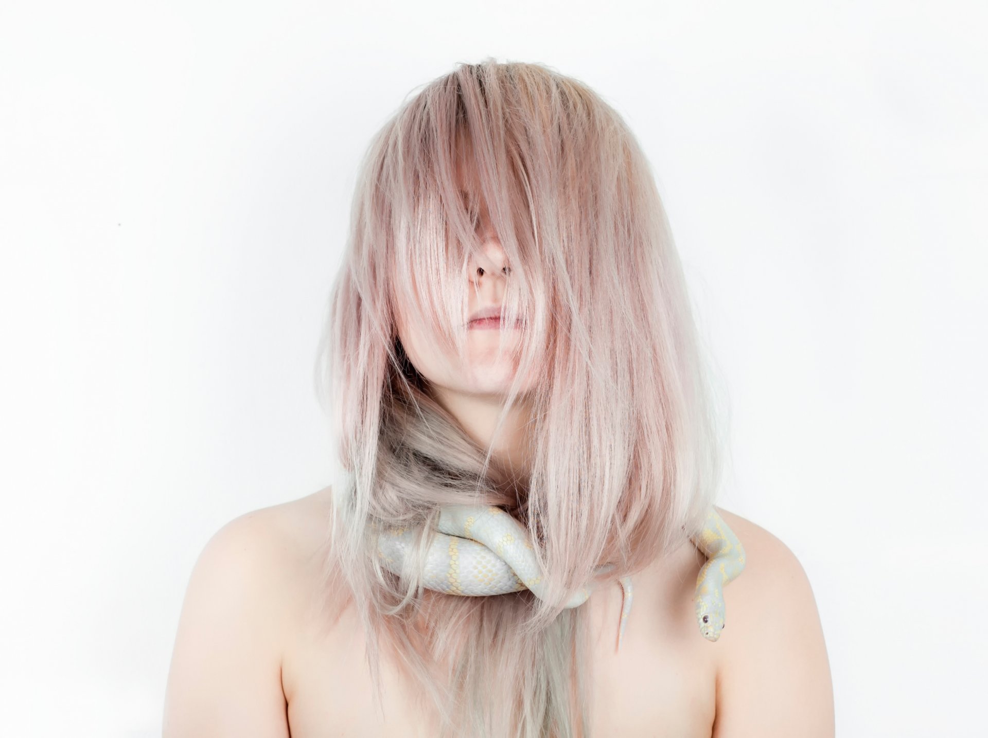 A girl on a white background with a neck on her neck