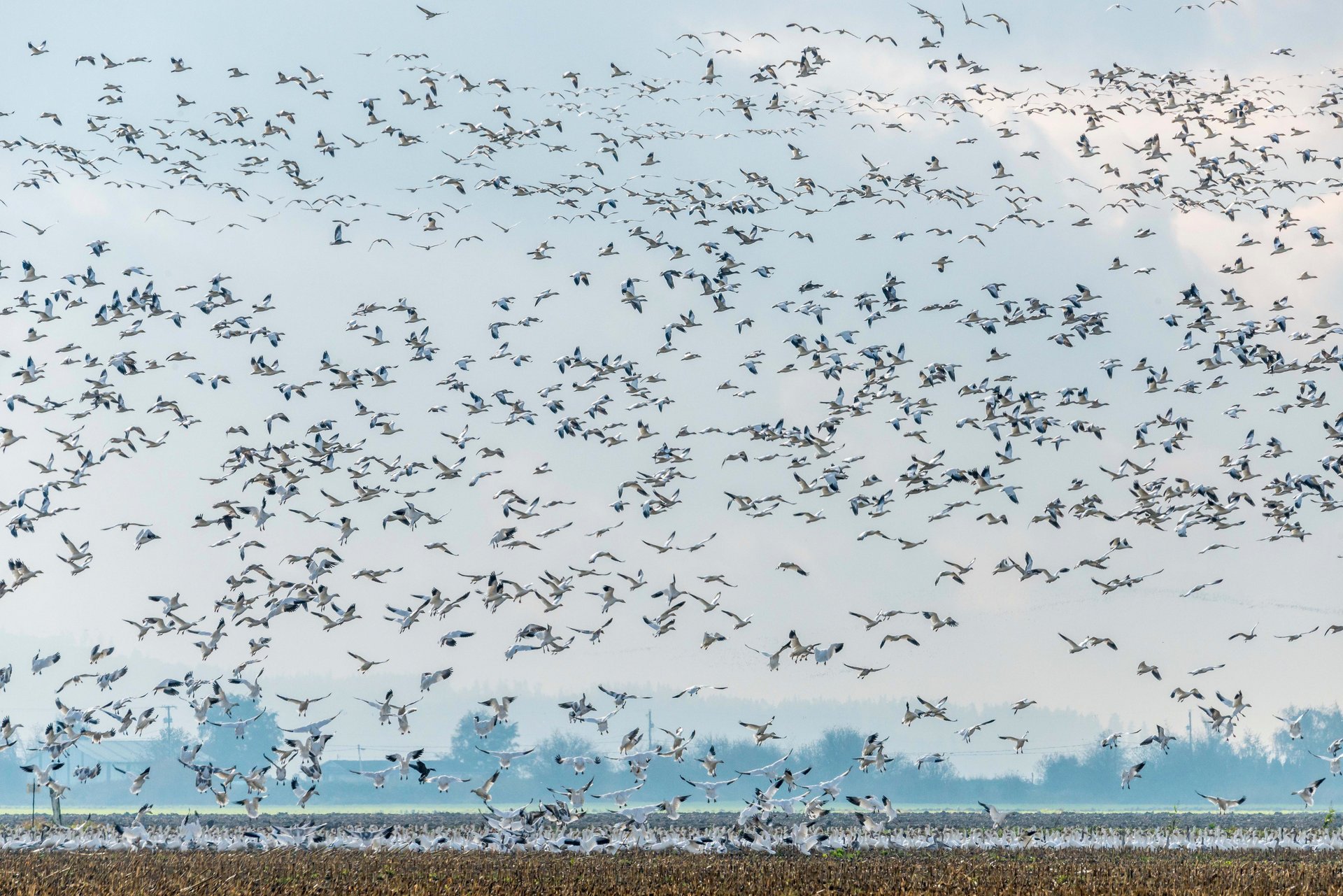 A flock of seabirds filled the entire space above the water