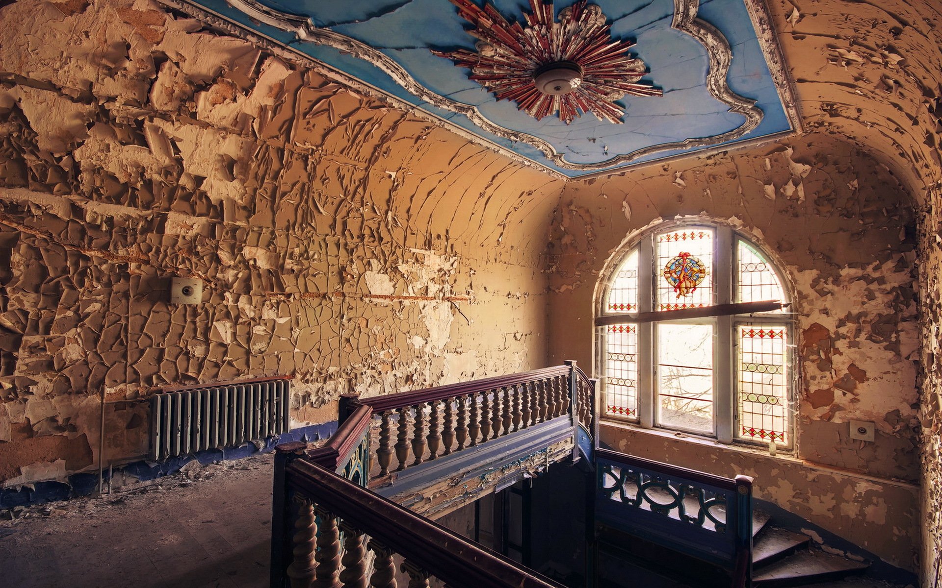 An old staircase with shabby walls and a window