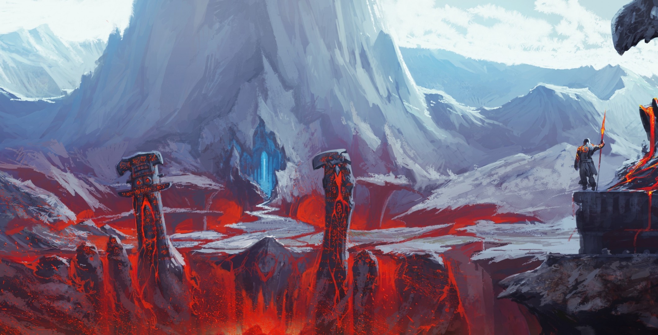 Fantasy image, the path to the cave, flooded with lava