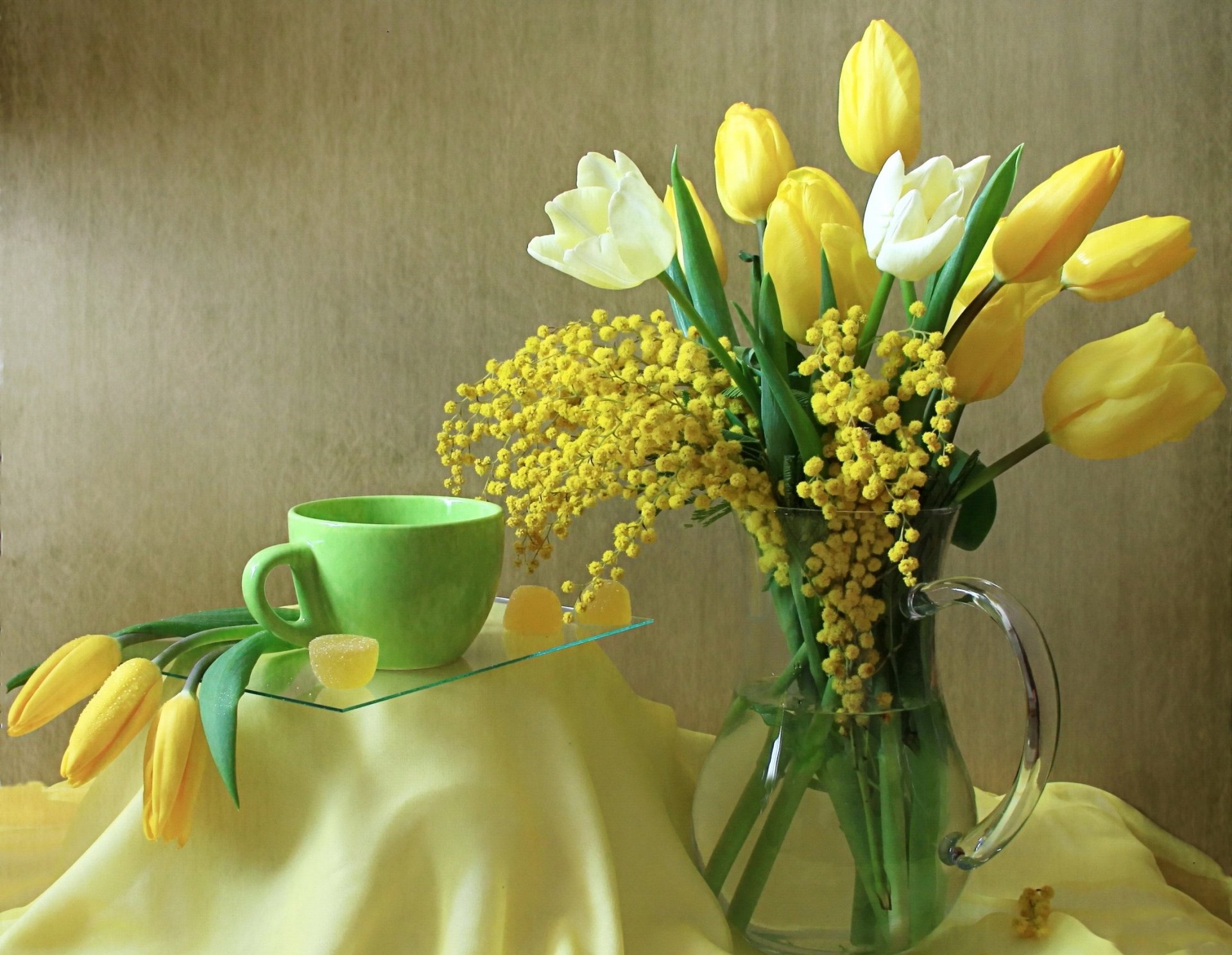 Still life jug with flowers and cup