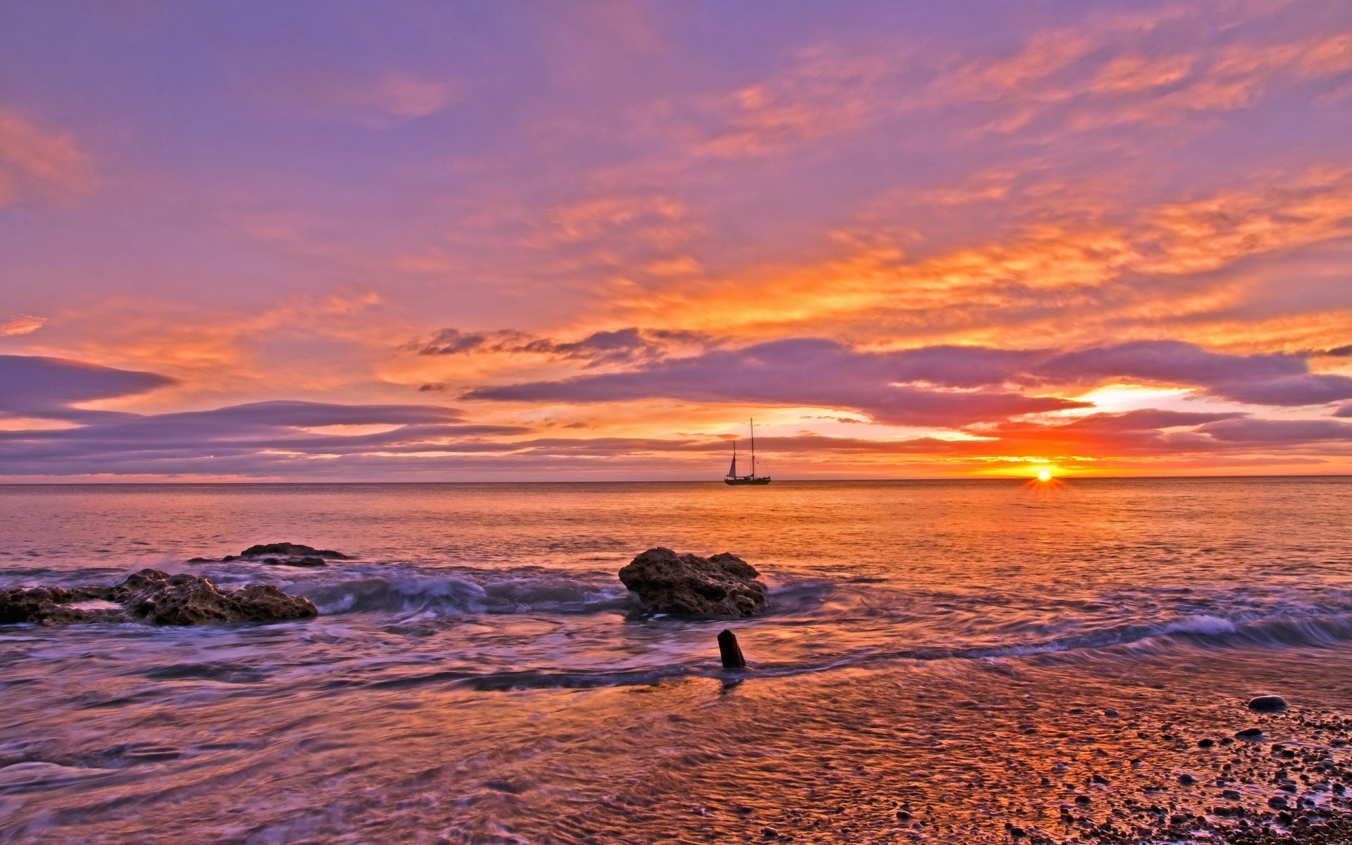 A sailboat in the distance at sunset. Calm and serenity of the sea