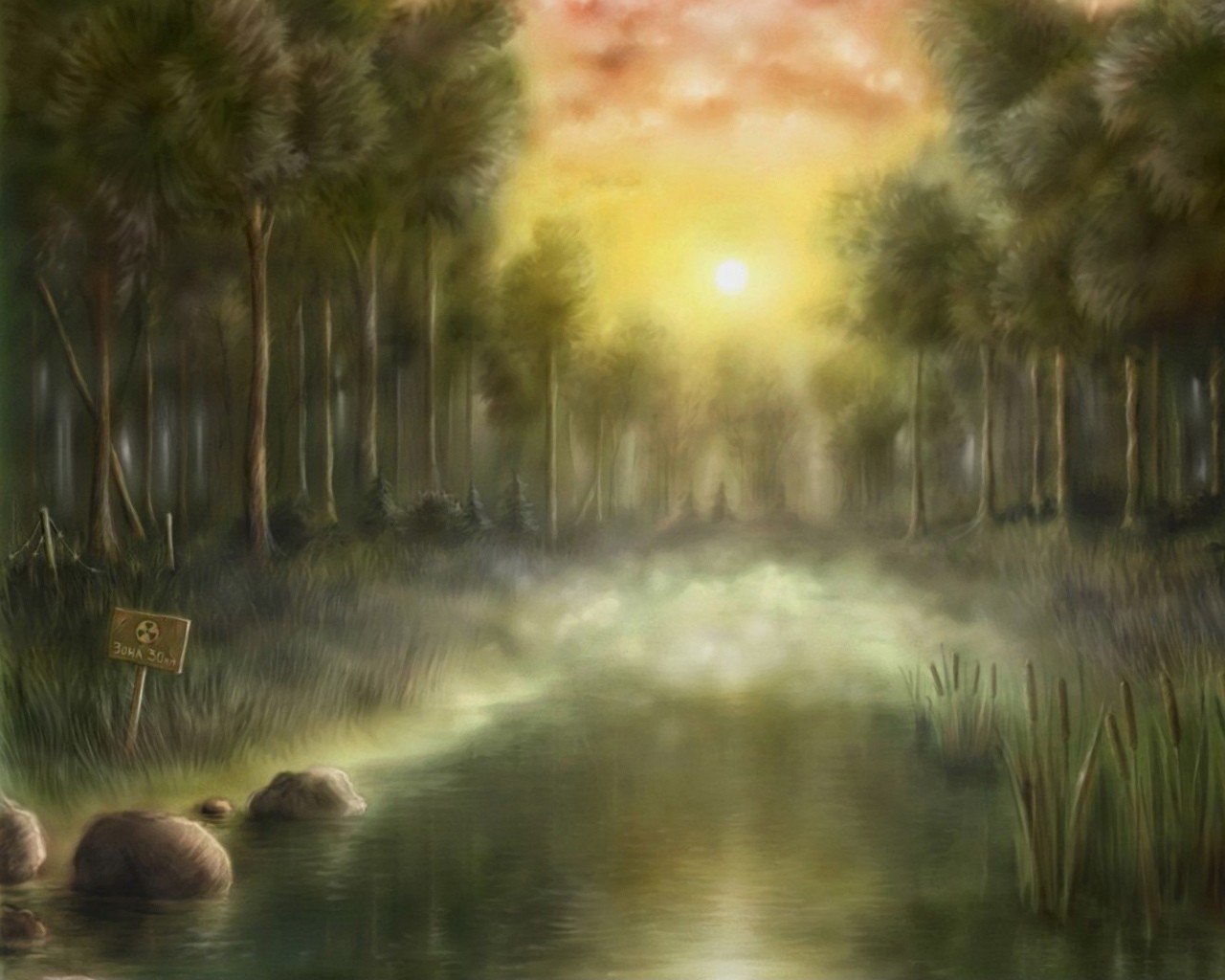 Landscape of a radioactive swamp at sunset