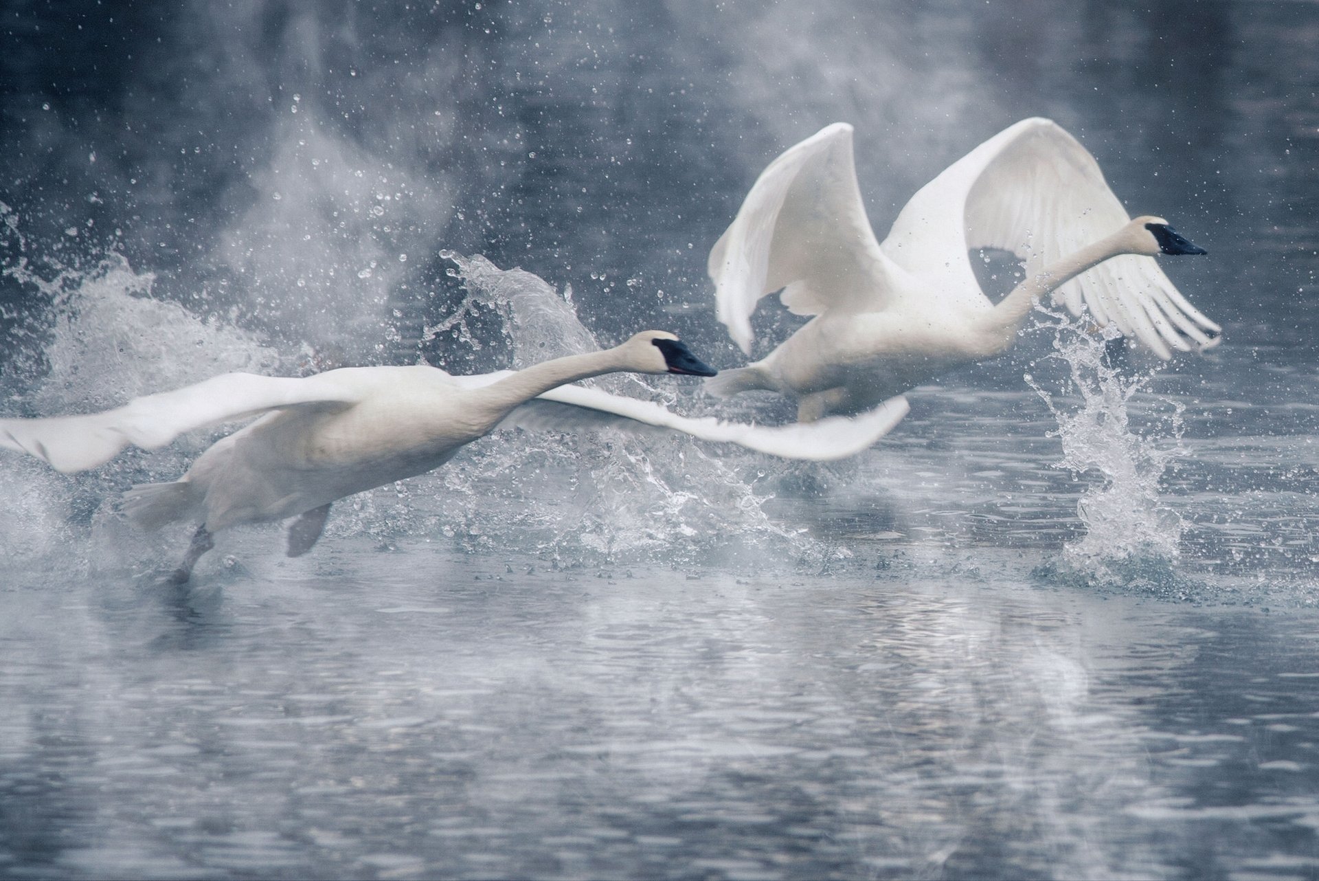 Two swans take off over the water surface