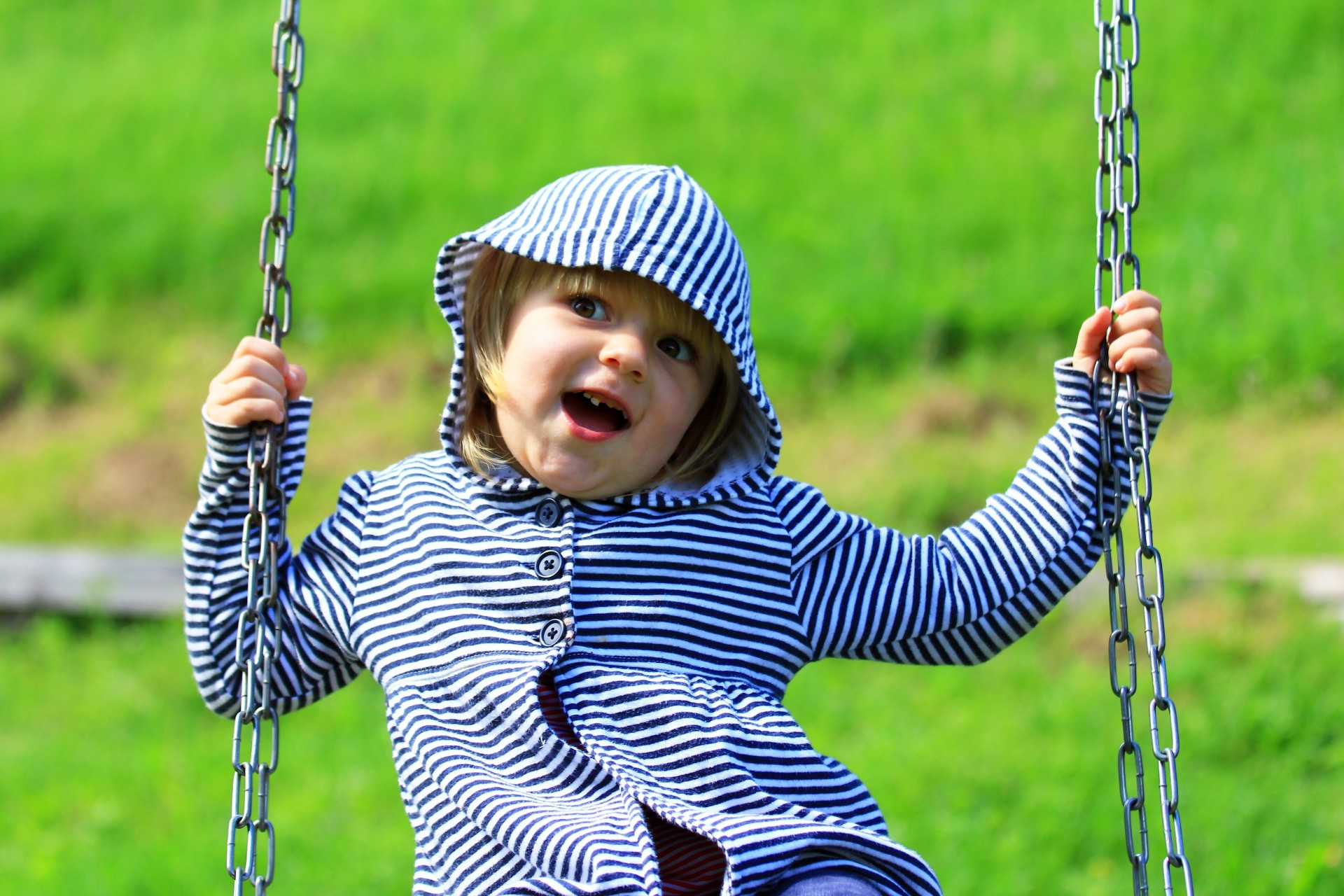 A child is swinging on a swing. A sweet girl smiles at summer