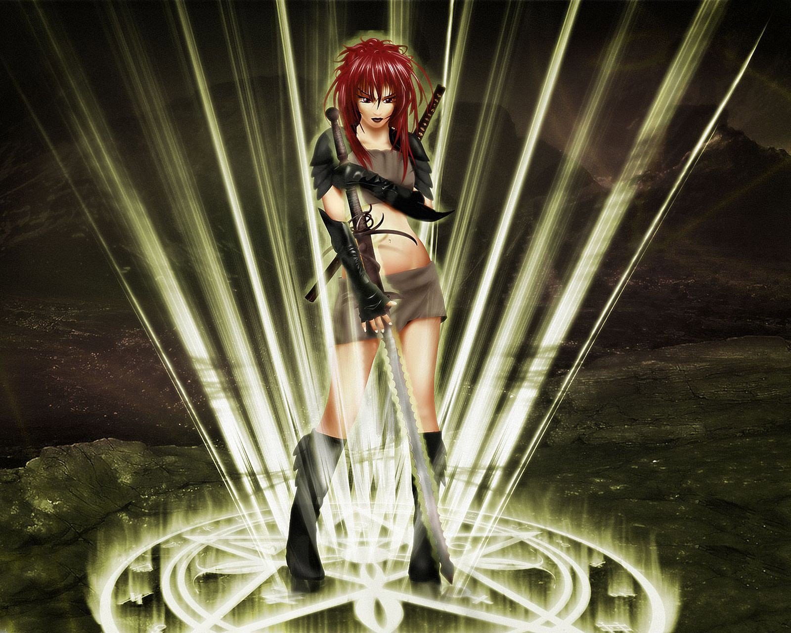 A drawing of a red-haired girl stands on a pentagram