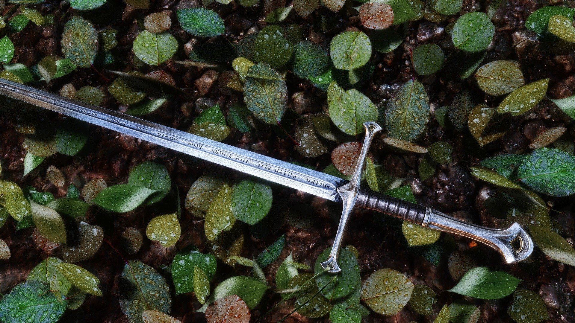 A sword on the fallen autumn wet leaves