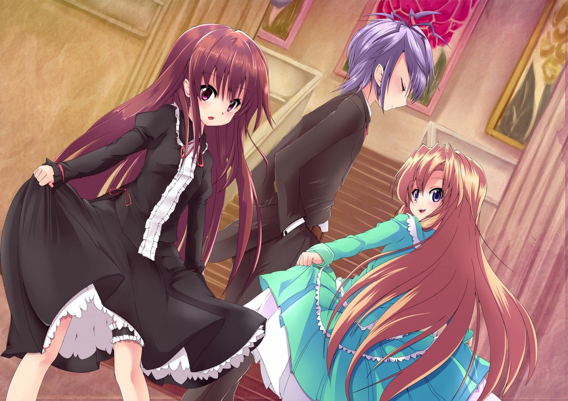 Image tags:tapes, blonde hair, blush, gary ib, pink eyes, long hair, purple hair, purple eyes, ladder, 2girls, dress, eve ib, mary ib, suit, brown hair
