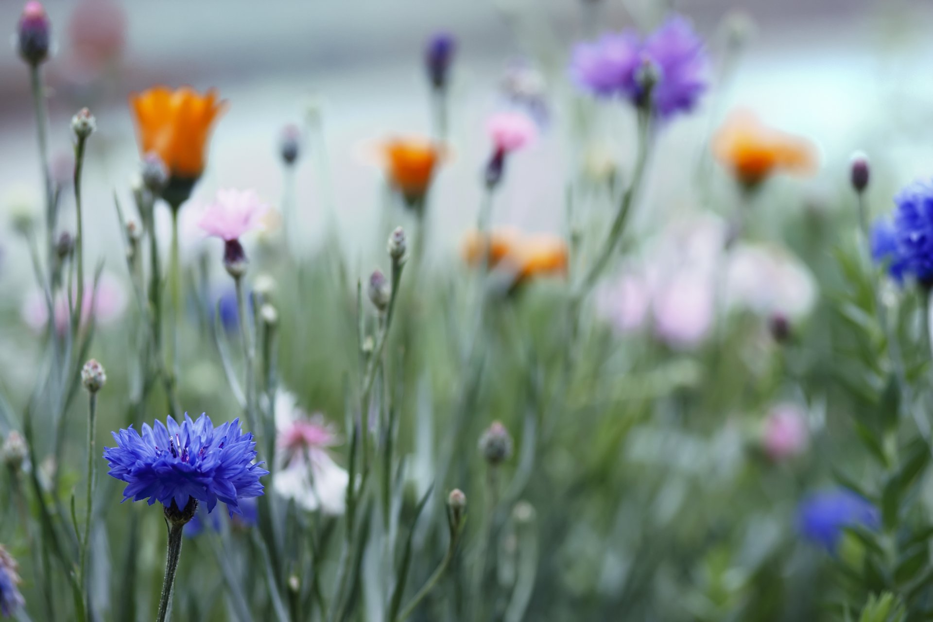 Colorful cornflowers on the grass in the field