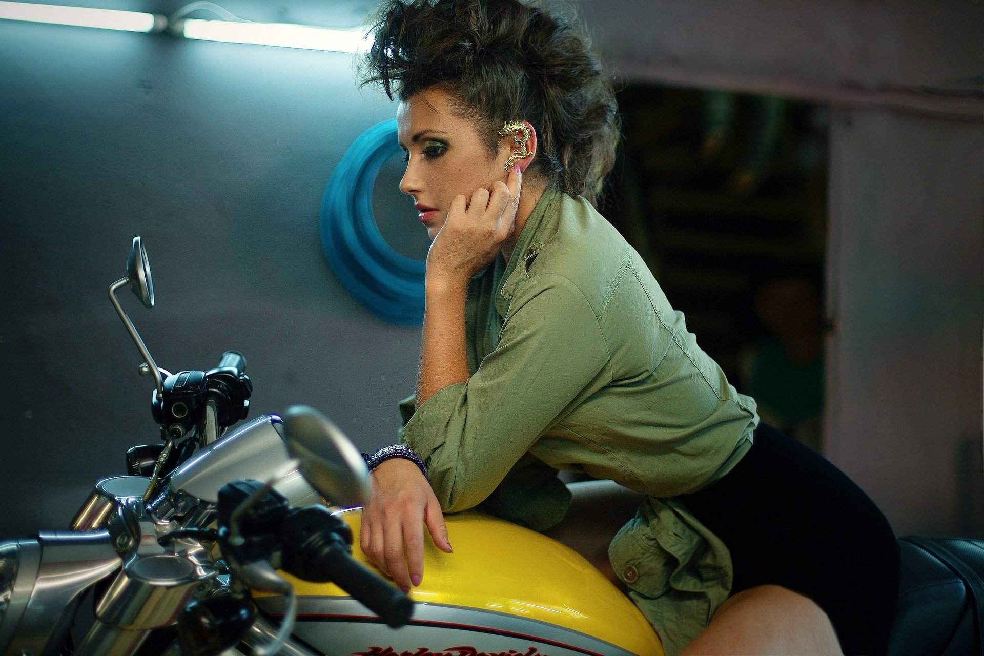The girl is sitting in the garage on a yellow motorcycle