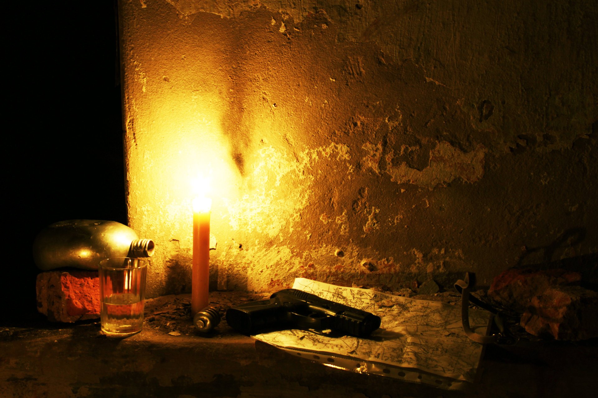 The gun is on the map. A candle is burning