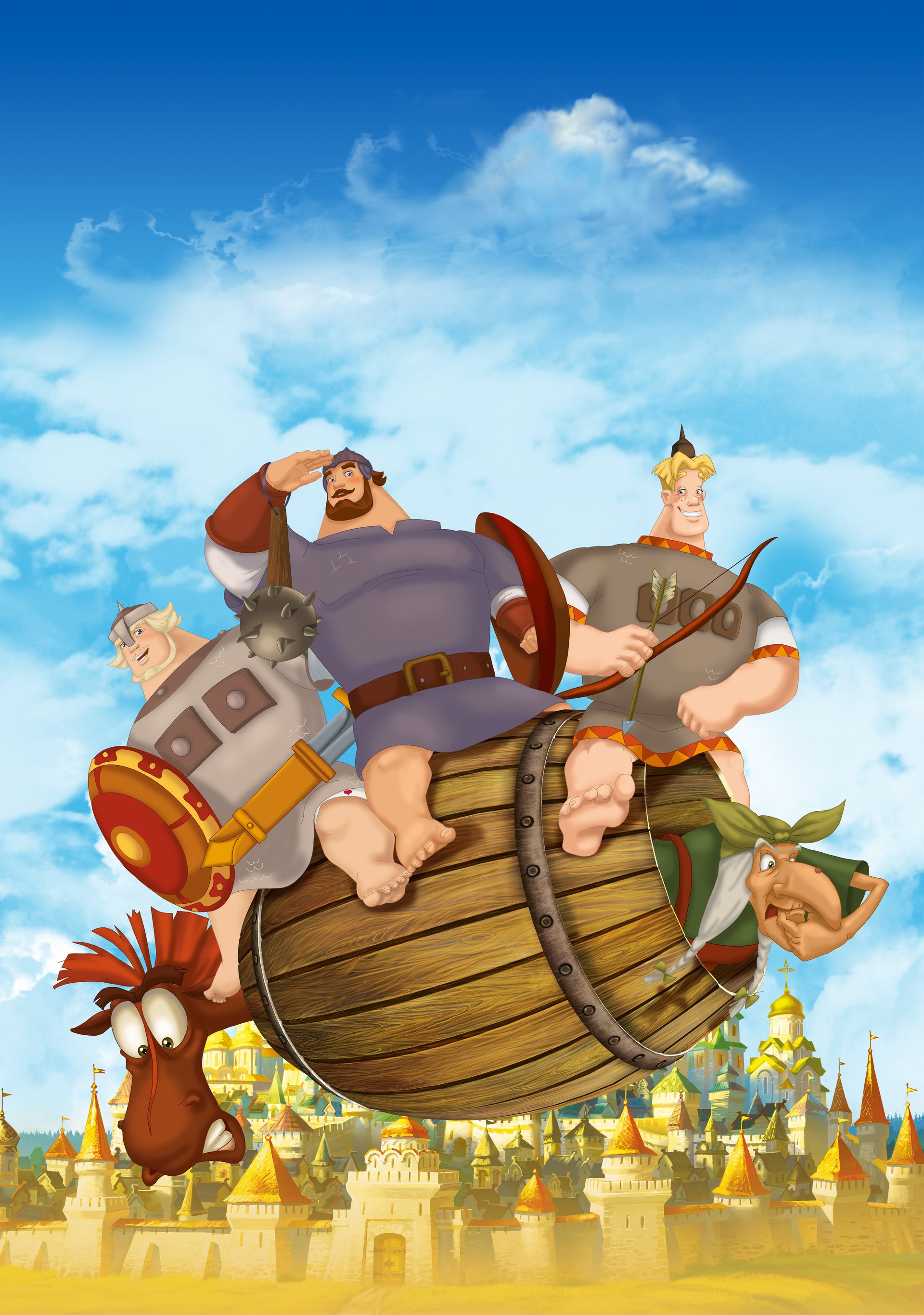 Three heroes flying on a barrel over Kiev