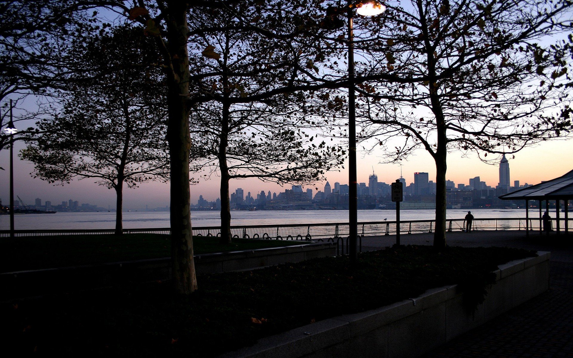 Romance, sunset on the river bank, metropolis in the distance