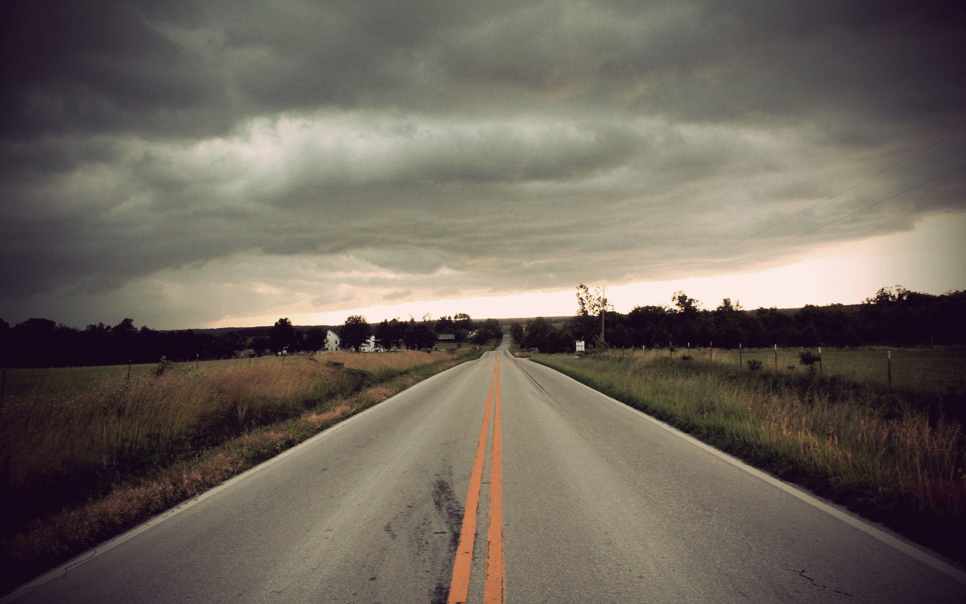 Dark clouds over the field and road