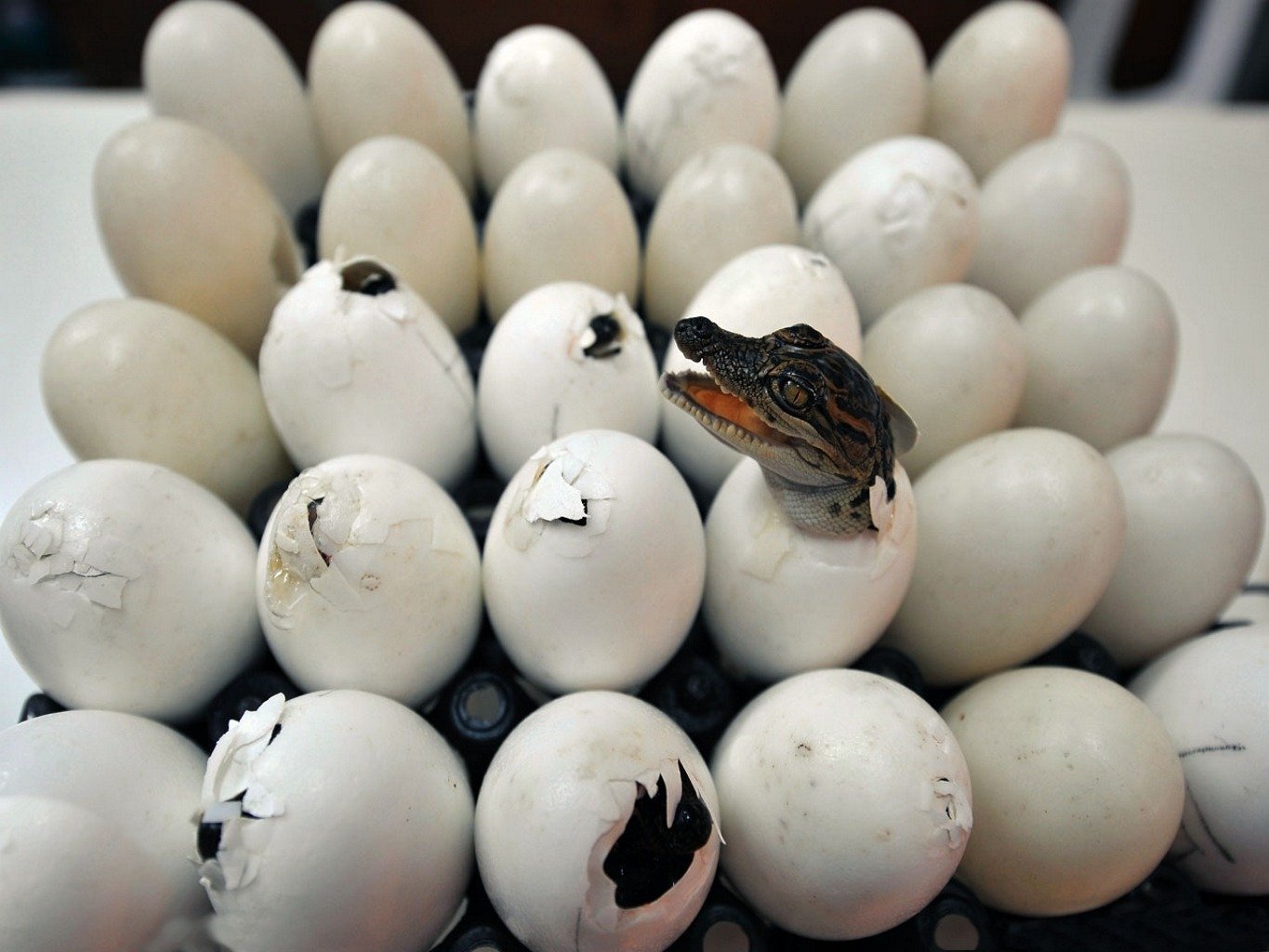 The birth of a small crocodile from an egg