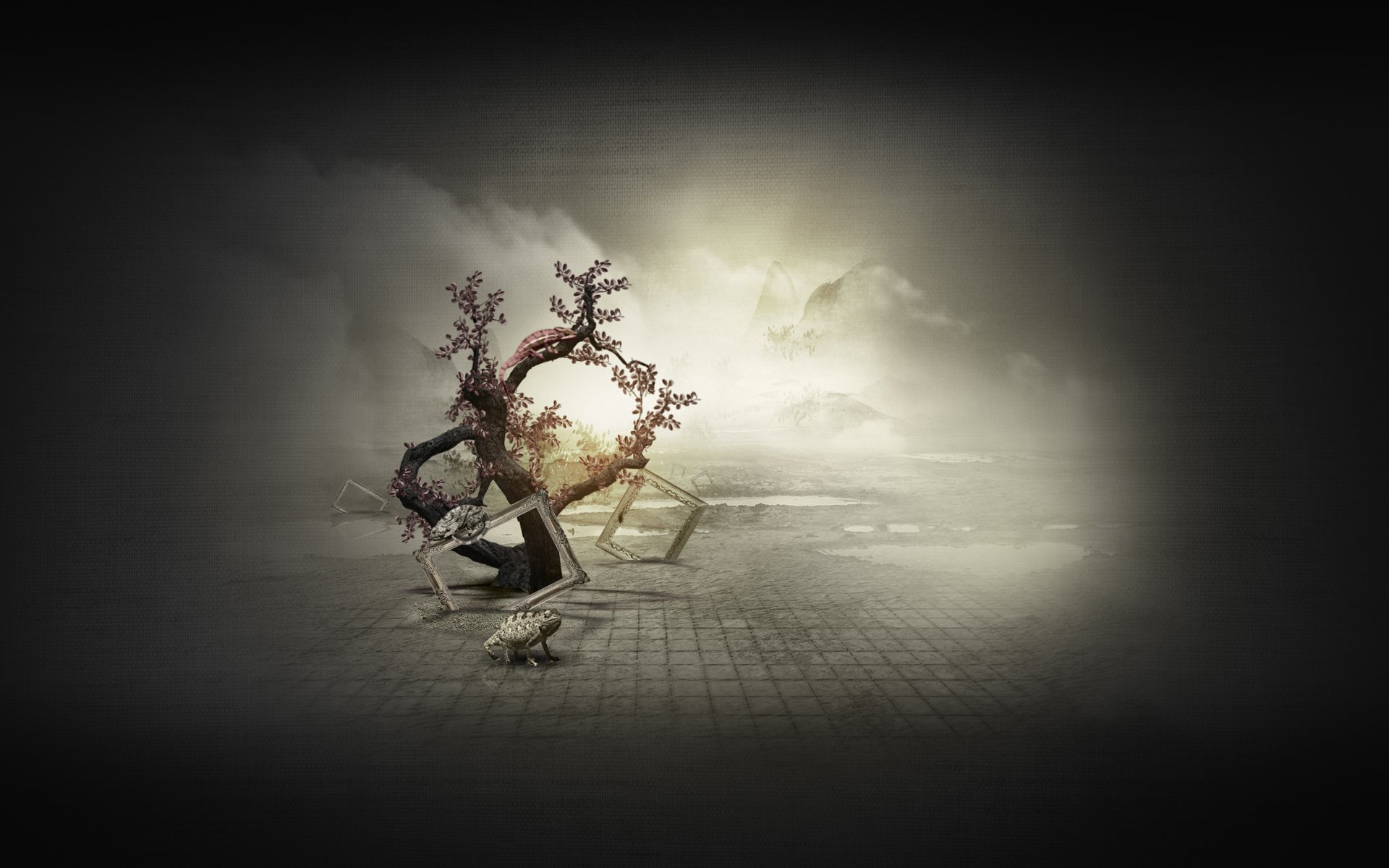 A broken tree in a dark glow