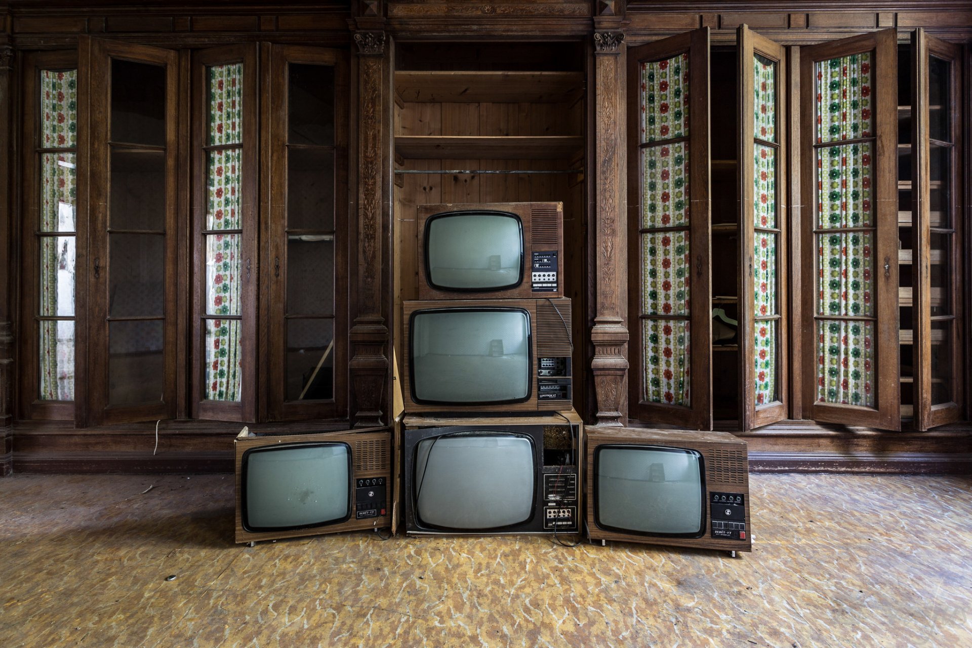 Pyramid of old TVs on the background of wooden cabinets