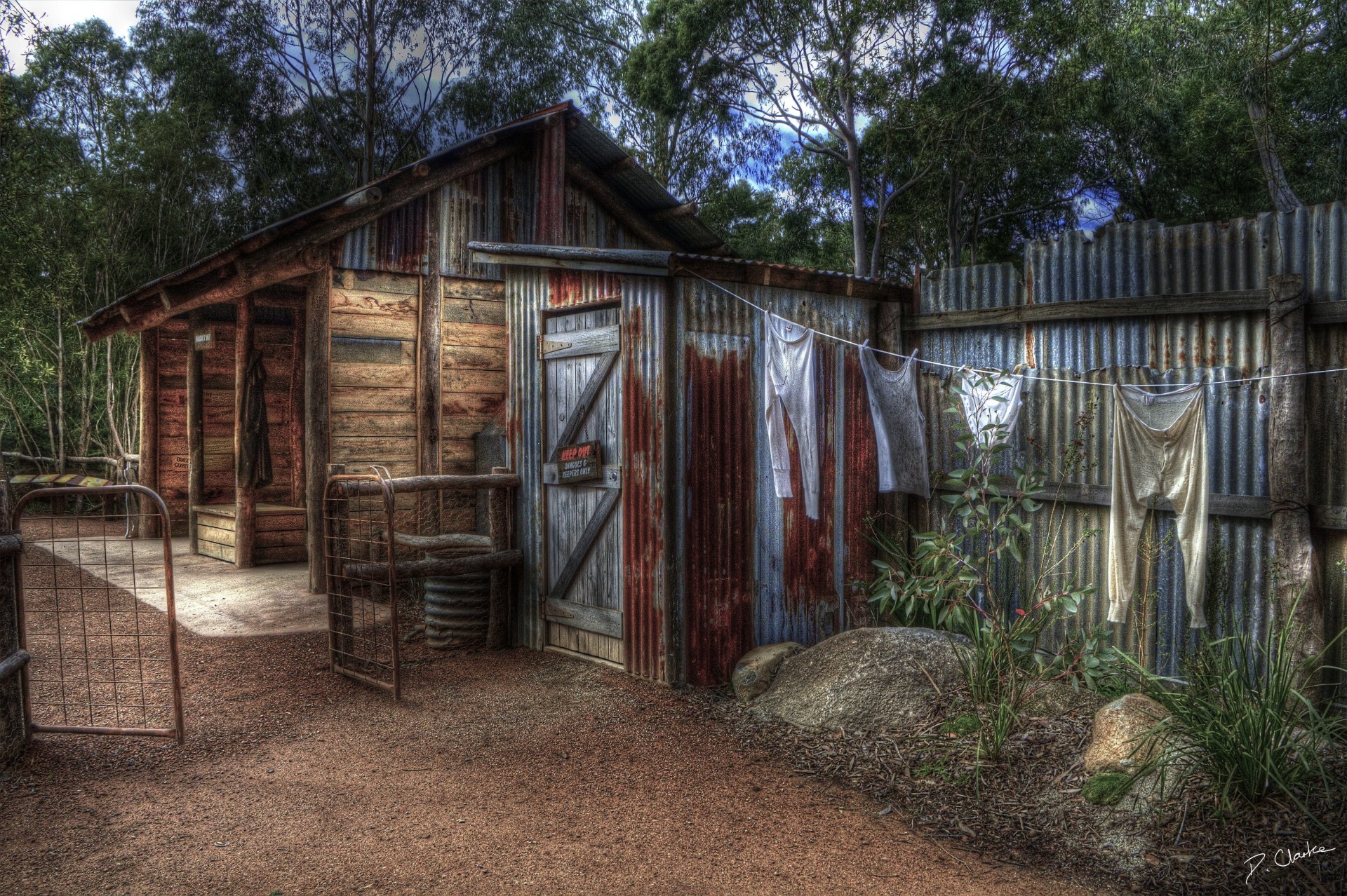 A rustic house with clothes hanging on a rope to dry