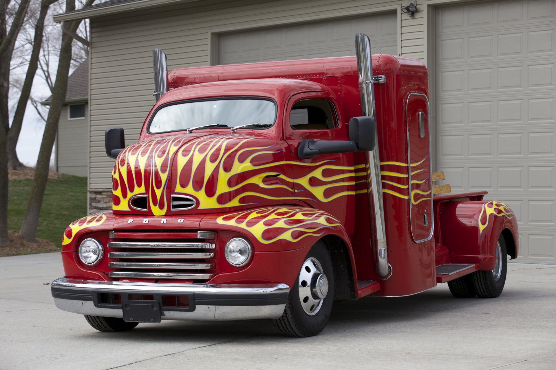 Image tags:vehicles, ford coe, 1950, a full-size station wagon, red, tuning, classic