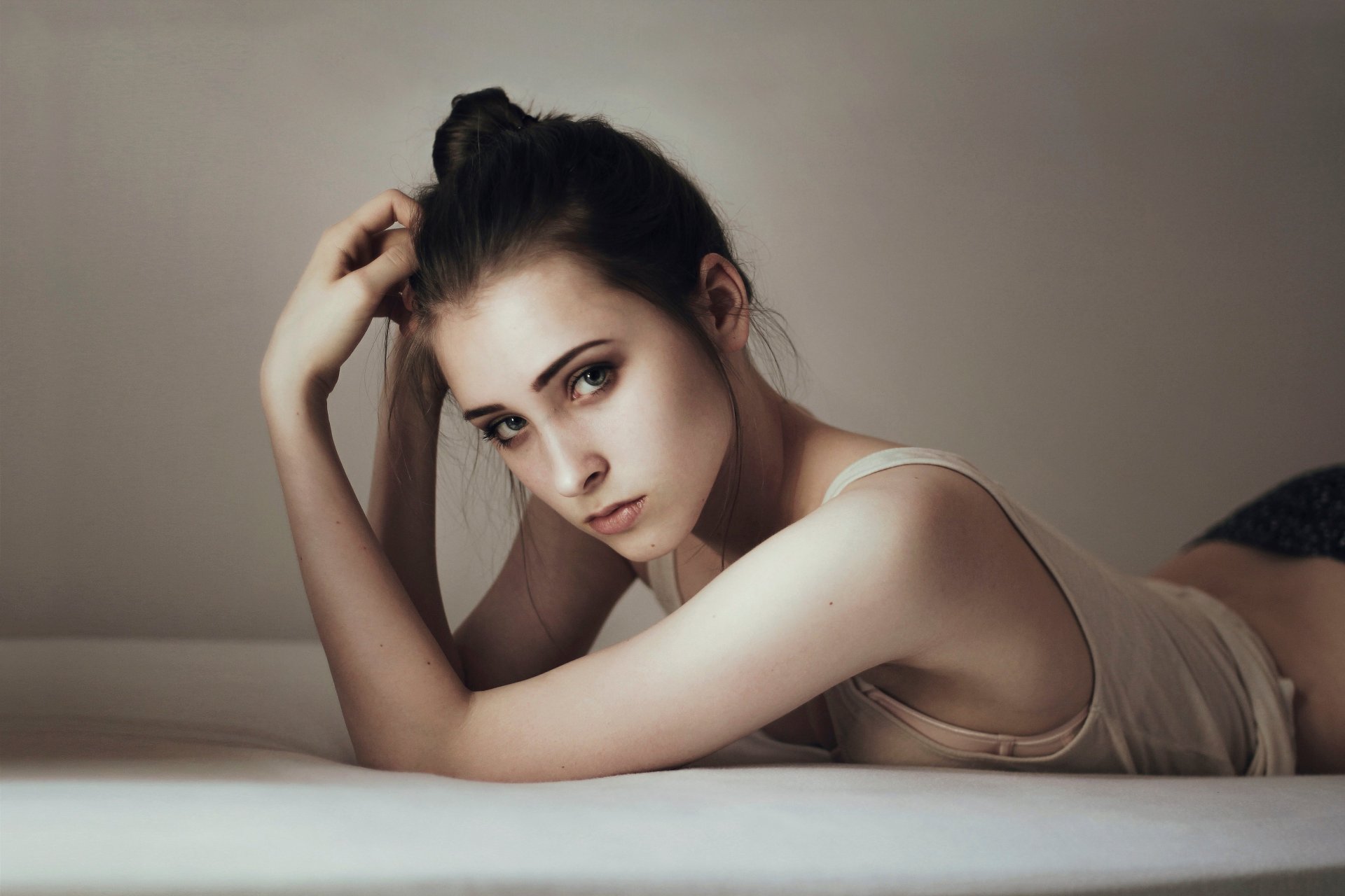 A girl with green eyes and brown hair in a bun is lying on the bed